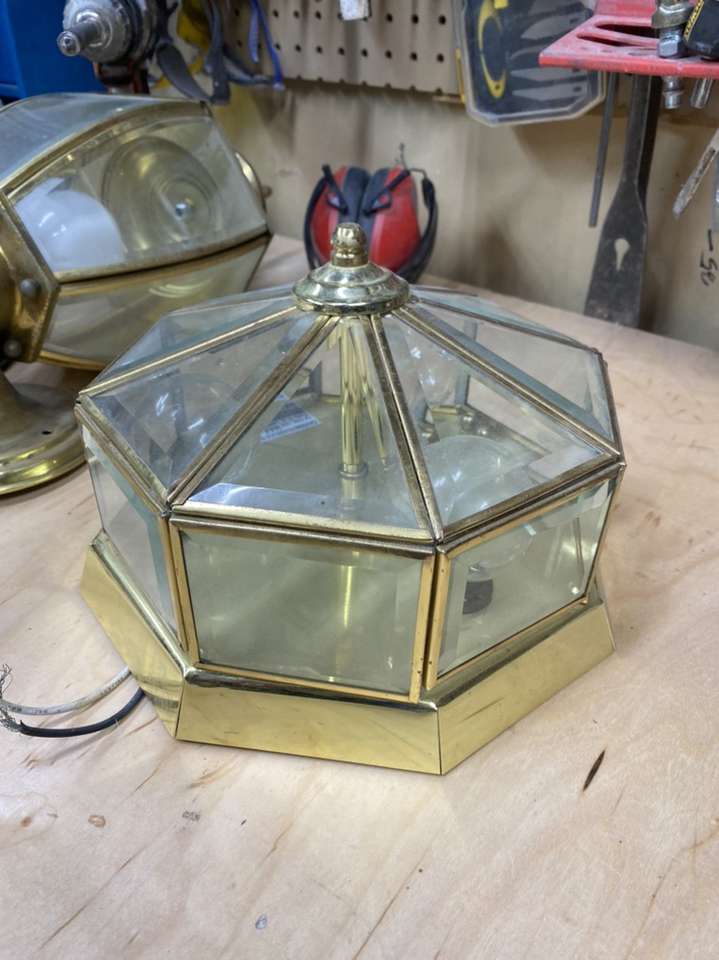 Mid-Century Polygon Brass & Beveled Glass Flush mount 3 lights
