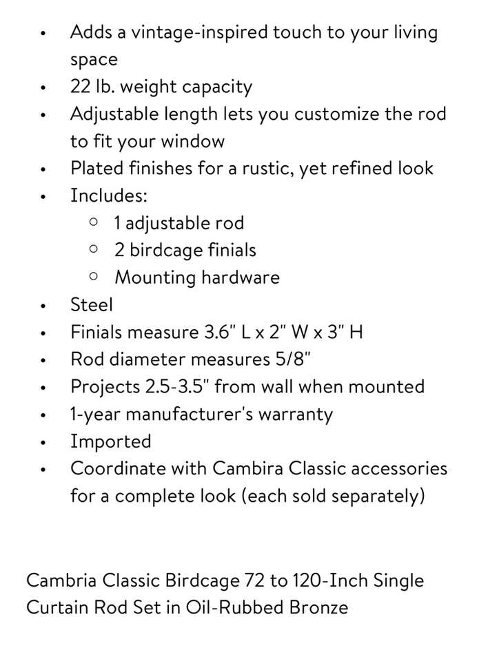 Description- Adjustable 72-120“ drapery rod set with decorative birdcage finials and 5/8 inch diameter rod in an oil rubbed bronze finish. See photos for more product information and specifications.