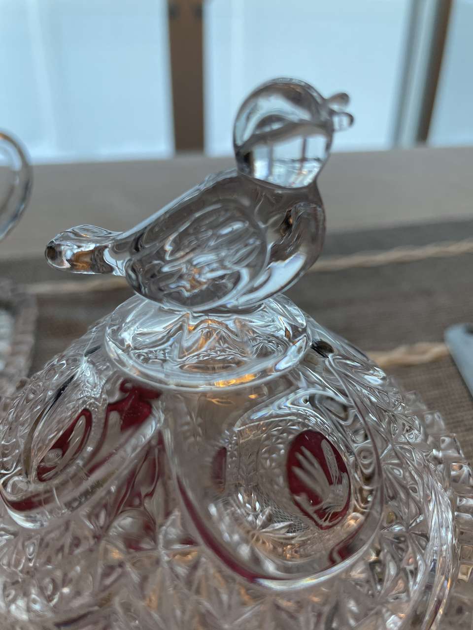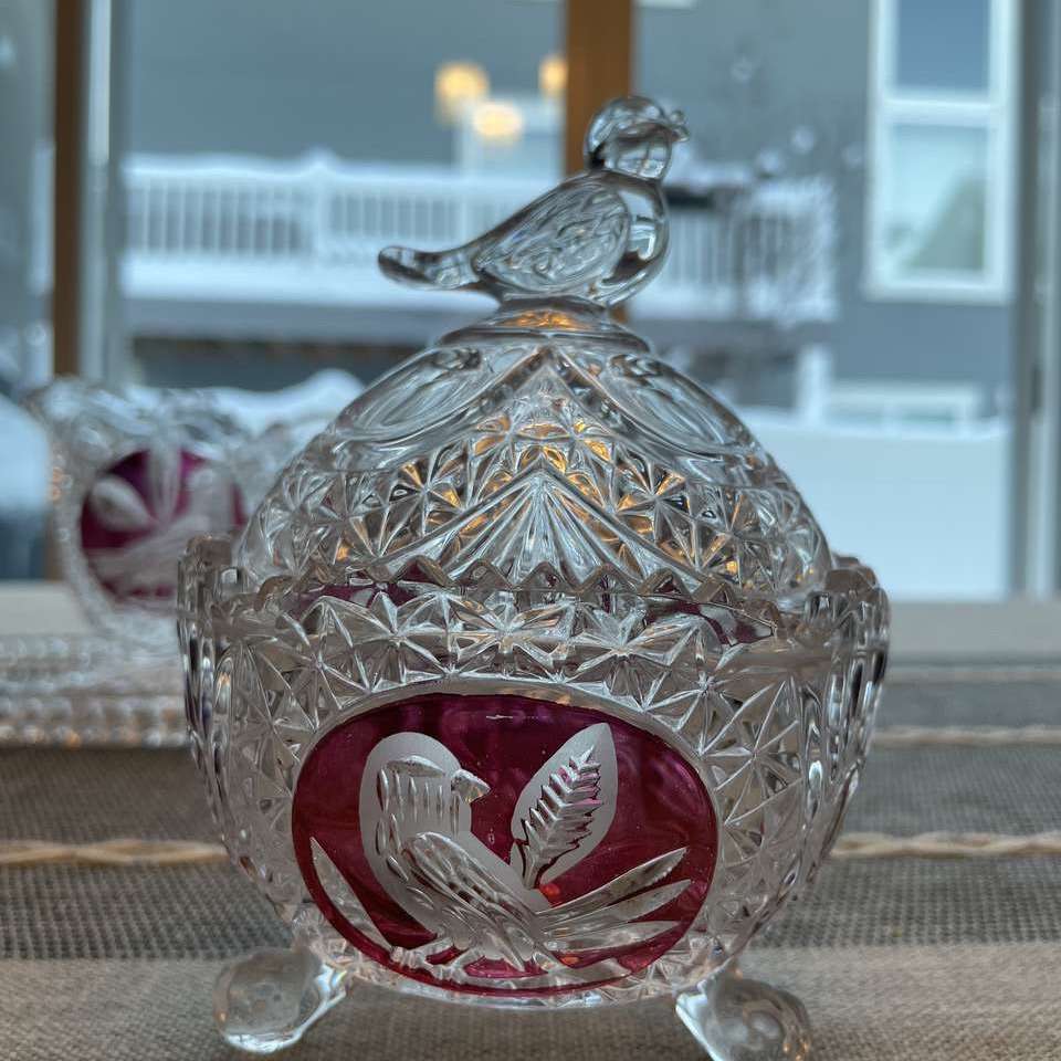 This lovely German crystal candy dish has a crystal bird on the lid. About 4 in diameter. About 5 inches tall. Rare piece. Asking $60 venmo or cash only.