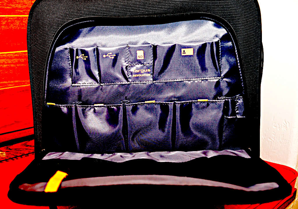 Plush-lined pocket holds tablets up to 10" Key fob Individual pockets for USB flash drive, SD card, business cards and pens Removable accessory pouch and side bottle pocket Transparent mobile phone compartment