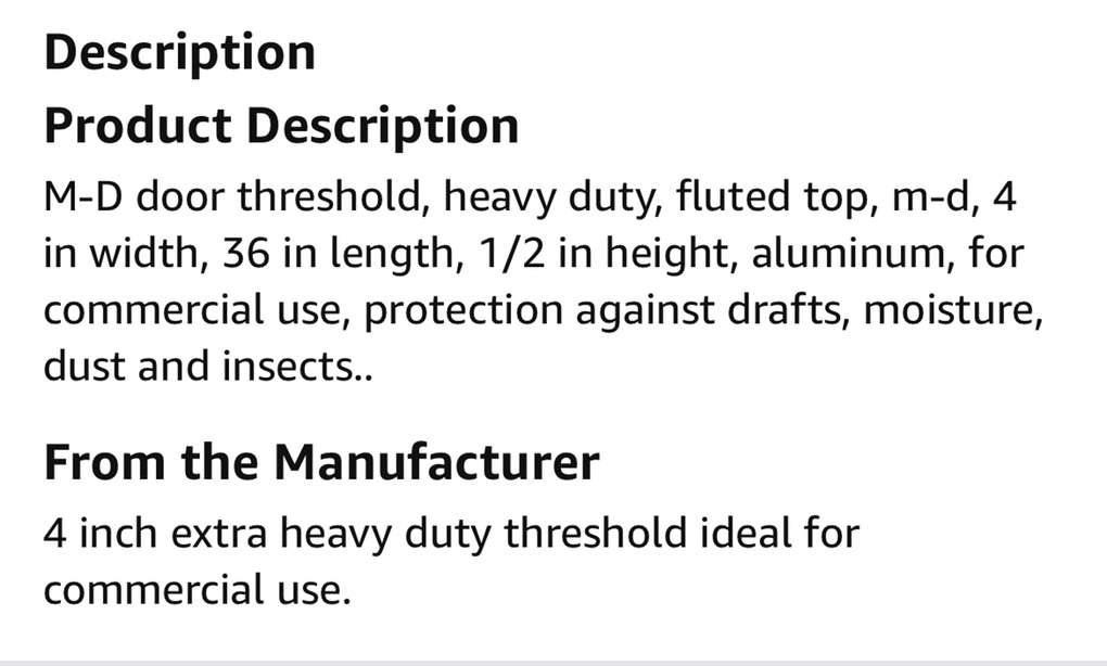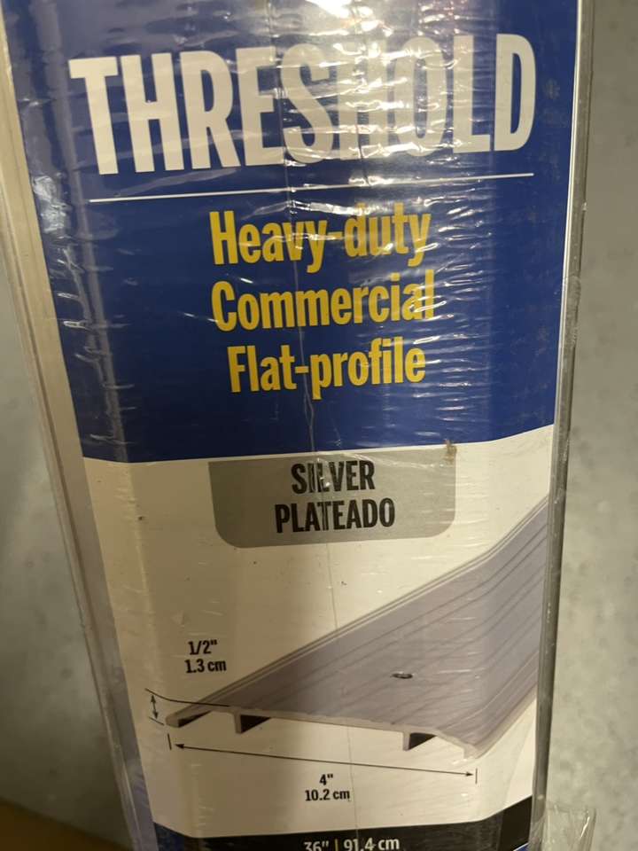 Description- 36” Trim-to-fit heavy duty residential/commercial flat profile threshold in silver. See photos for more product information and specifications.