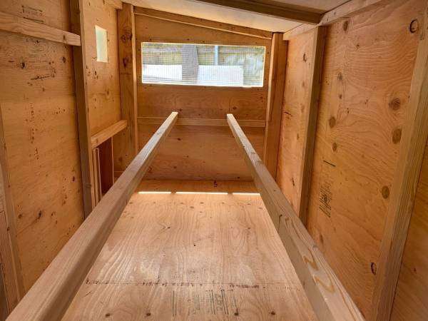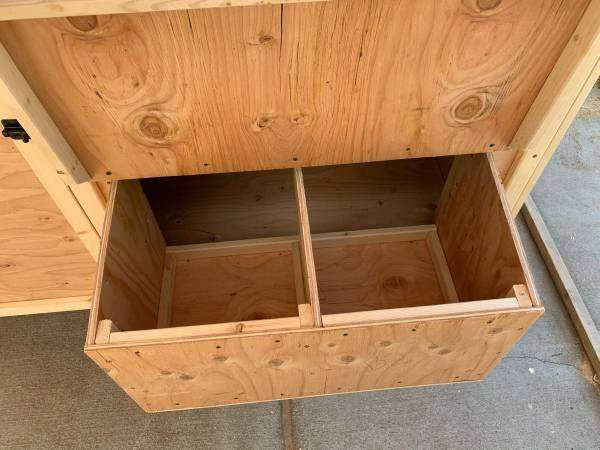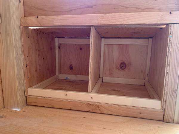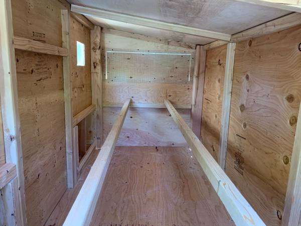 It includes: • 2 nesting boxes with 2 nesting/egg laying spots in each box • 2 big ventilation Windows on each side • 2 doors to access the eggs • Two roosting poles • 1 (16in x 16in) chicken access door • 1 (3.5ft x 2ft) large human access door/cleaning door • Made from new plywood • Wire mesh behind both the ventilation windows to keep the animals out •comes with ladder •The roof is made of plywood. I highly recommend adding shingles or a correlated roof to protect the coop. I can add shingles for $150