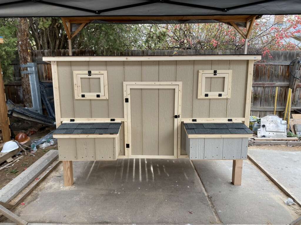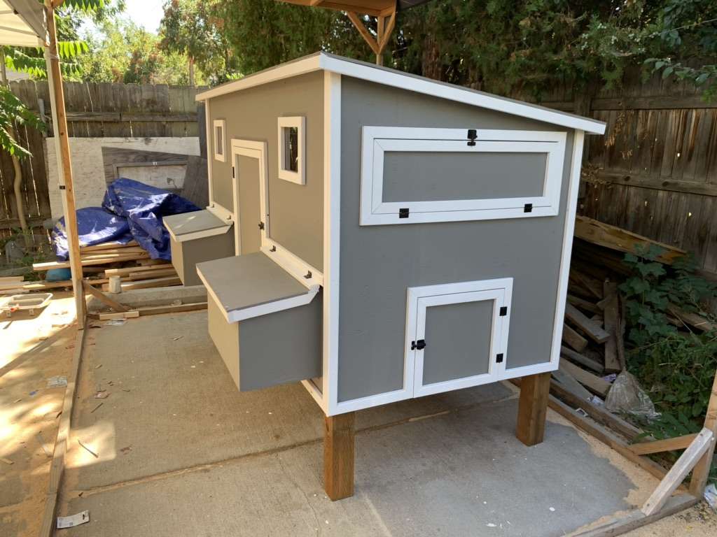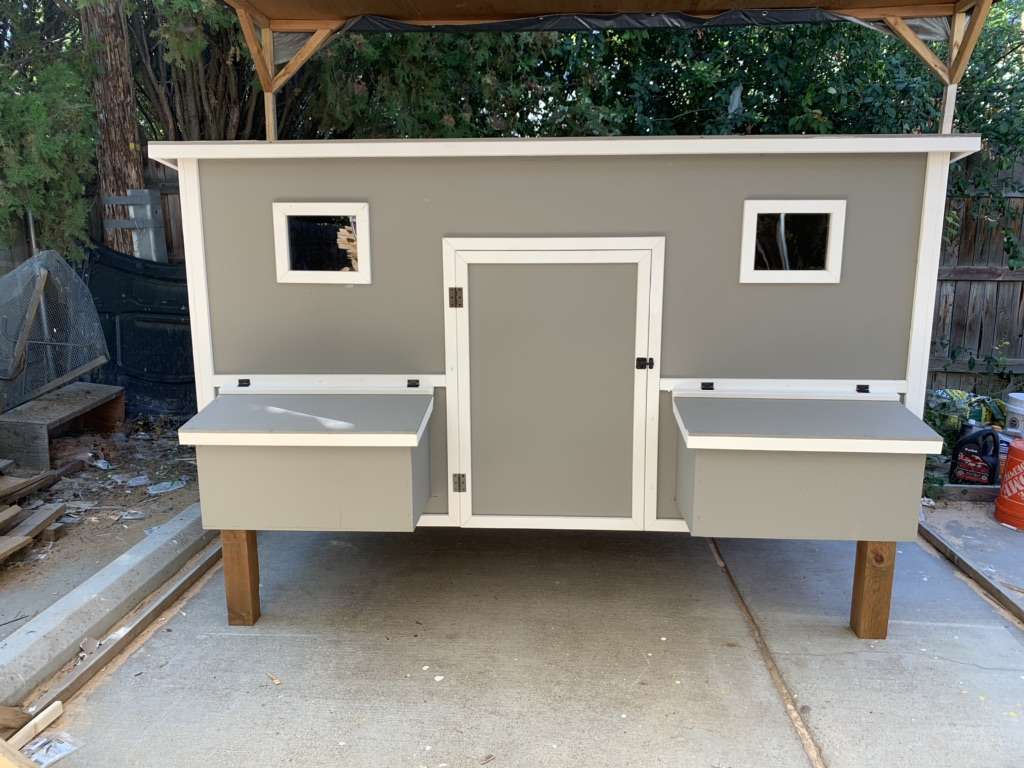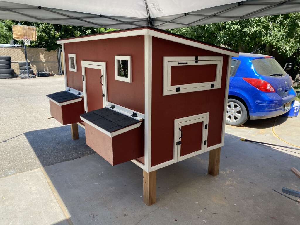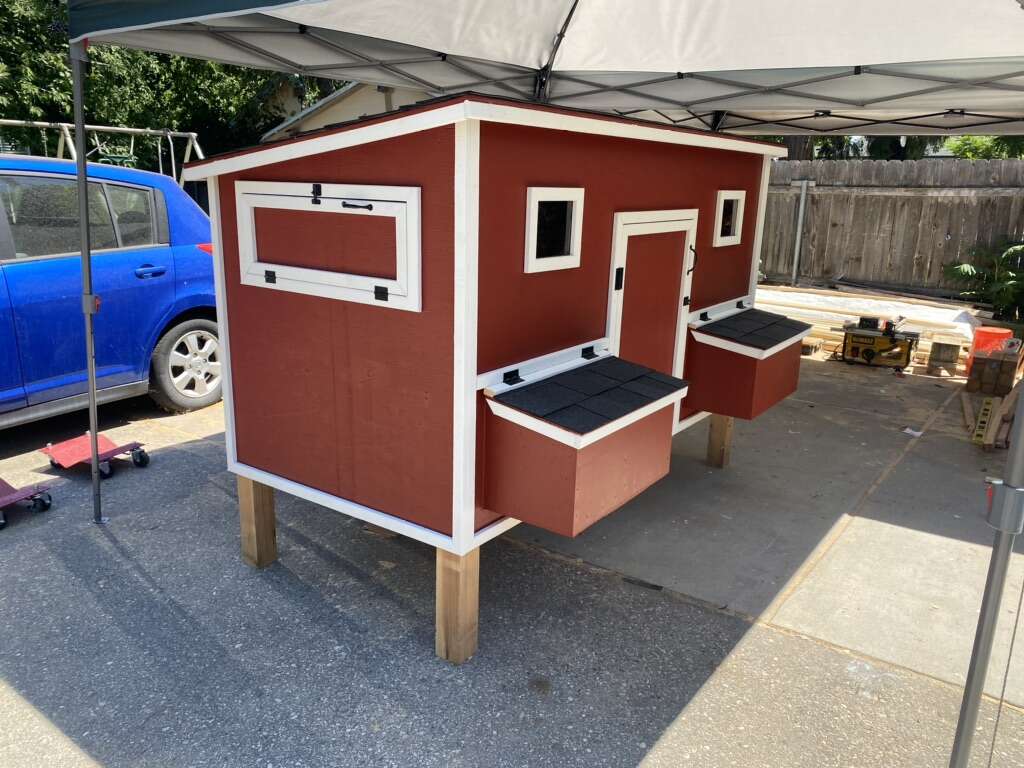 Options: Paint the coop $125 Paint the trim $125 Shingles $150 Handles on all doors $30 Upgrade windows to 11”x14” $30 Upgrade to 4x4 treated posts for legs $20 Upgrade plywood from 3/8 to 1/2 plywood $160 Upgrade walls to OSB LP Siding $160 Upgrade walls to T1-11 Plywood siding $100