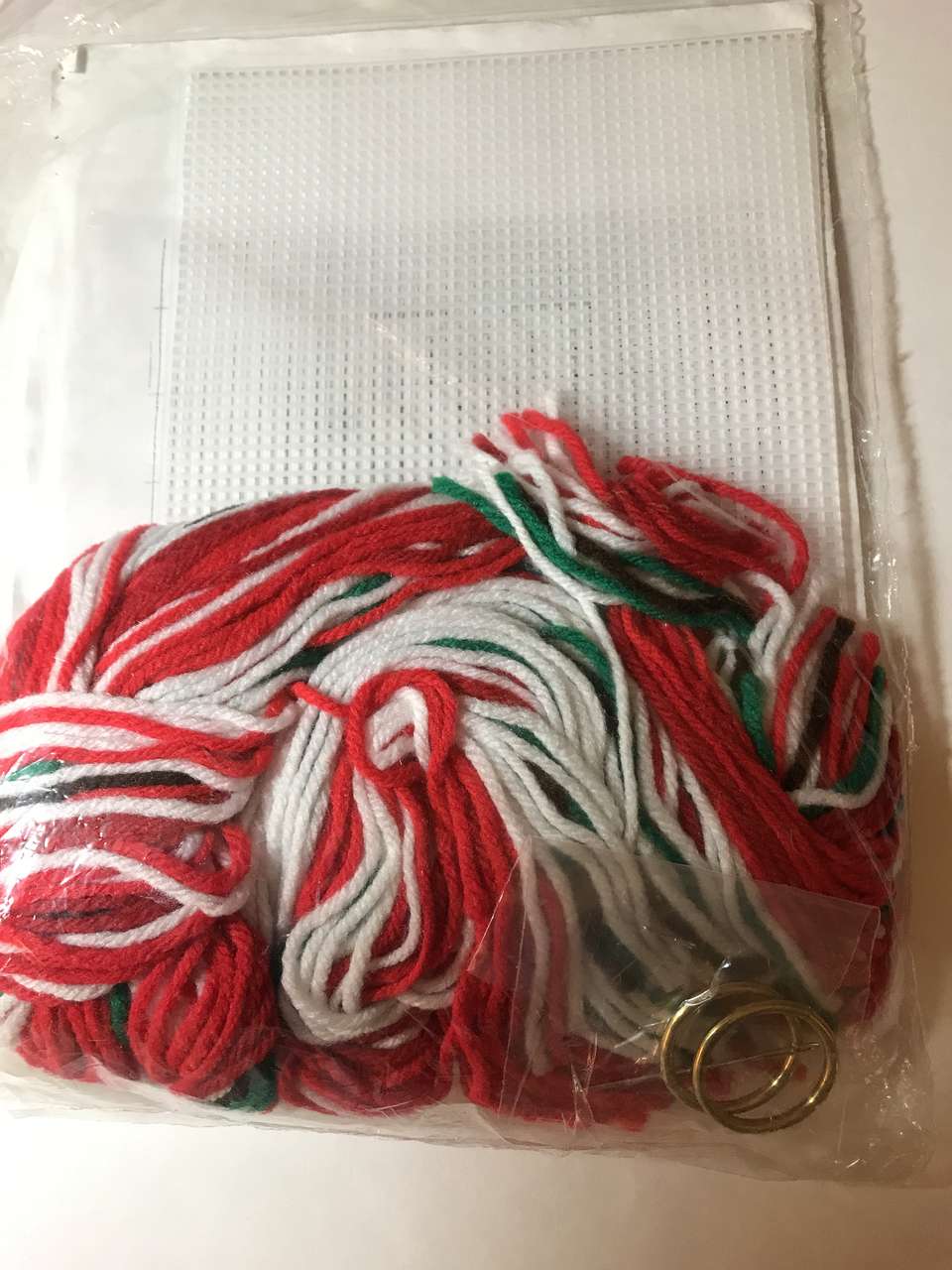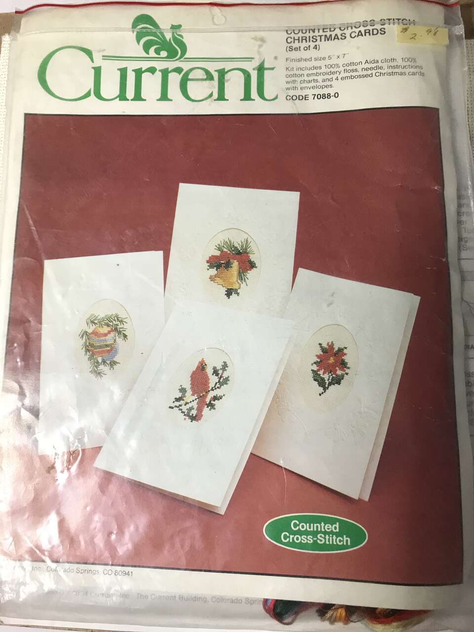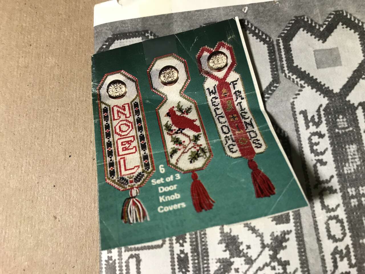 Christmas Doorknob Decorations, this is a partial kit. Comes with white heavy plastic canvas, instructions for all 3 and some yarn to do one of the doorknob decorations. Also included is a Country Cross Stitch Card Kit. You will need a needle to complete 1. 3 of the 4"x 6" fabrics have been completed. The instructions, some thread and fabric left to do the last one. You will need a needle and cards if you want to turn them into cards. Can be framed or made into tree Ornaments. $10.00