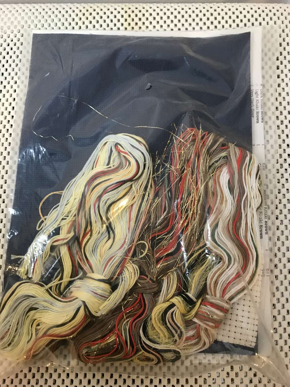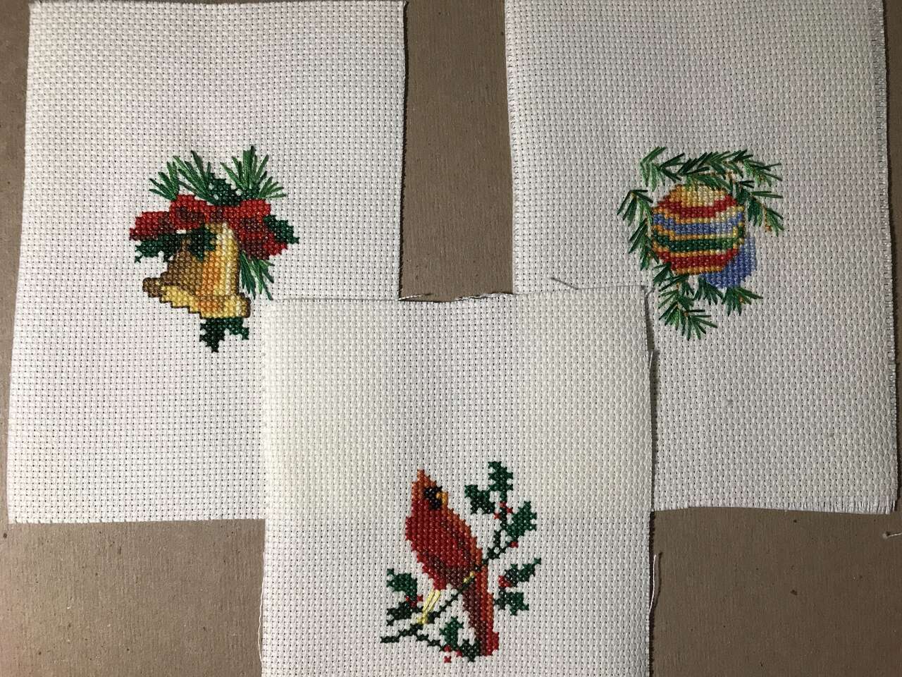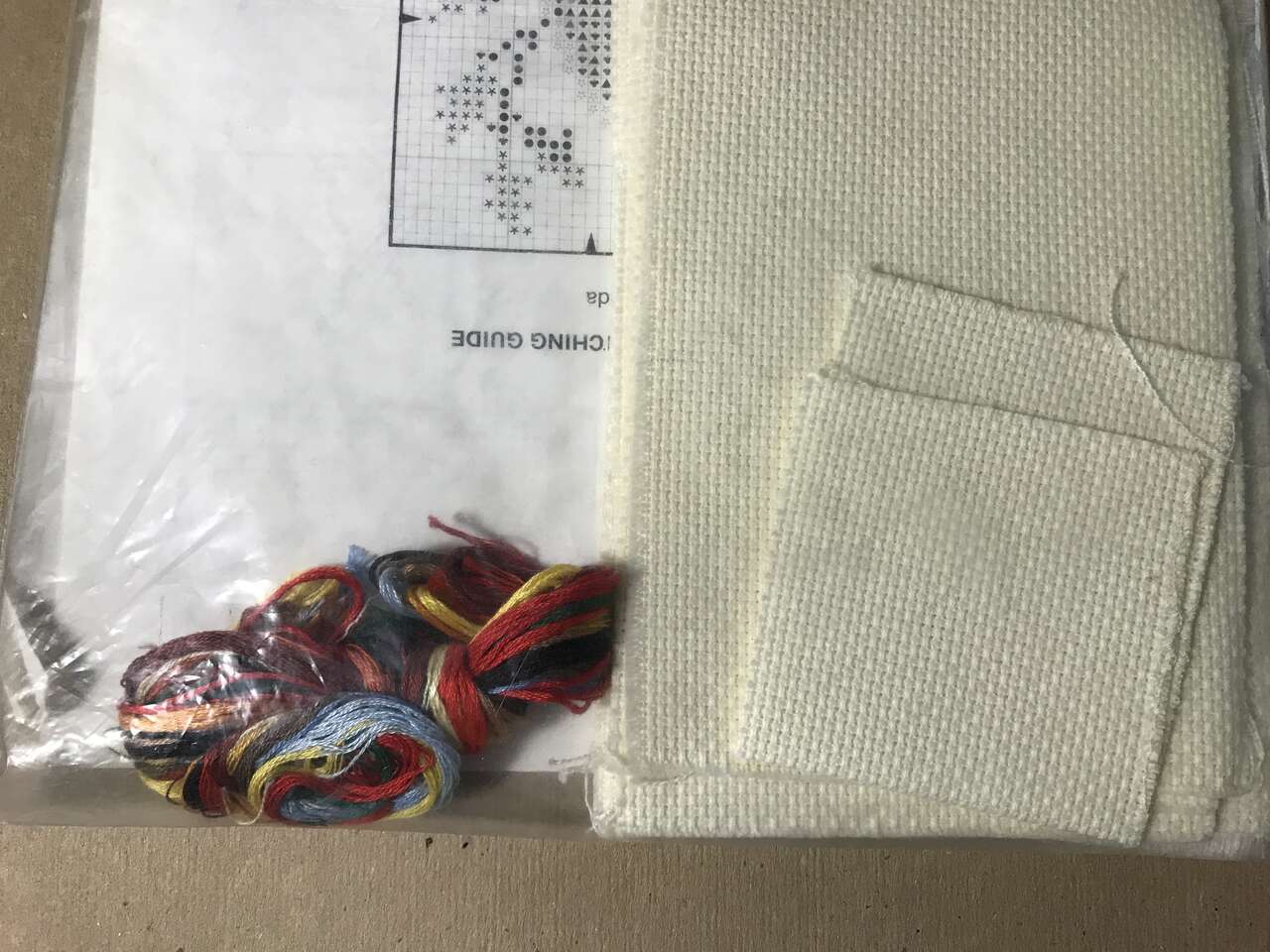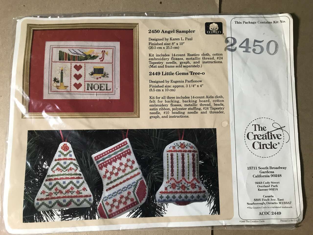 Christmas Doorknob Decorations, this is a partial kit. Comes with white heavy plastic canvas, instructions for all 3 and some yarn to do one of the doorknob decorations. Also included is a Country Cross Stitch Card Kit. You will need a needle to complete 1. 3 of the 4"x 6" fabrics have been completed. The instructions, some thread and fabric left to do the last one. You will need a needle and cards if you want to turn them into cards. Can be framed or made into tree Ornaments. $10.00