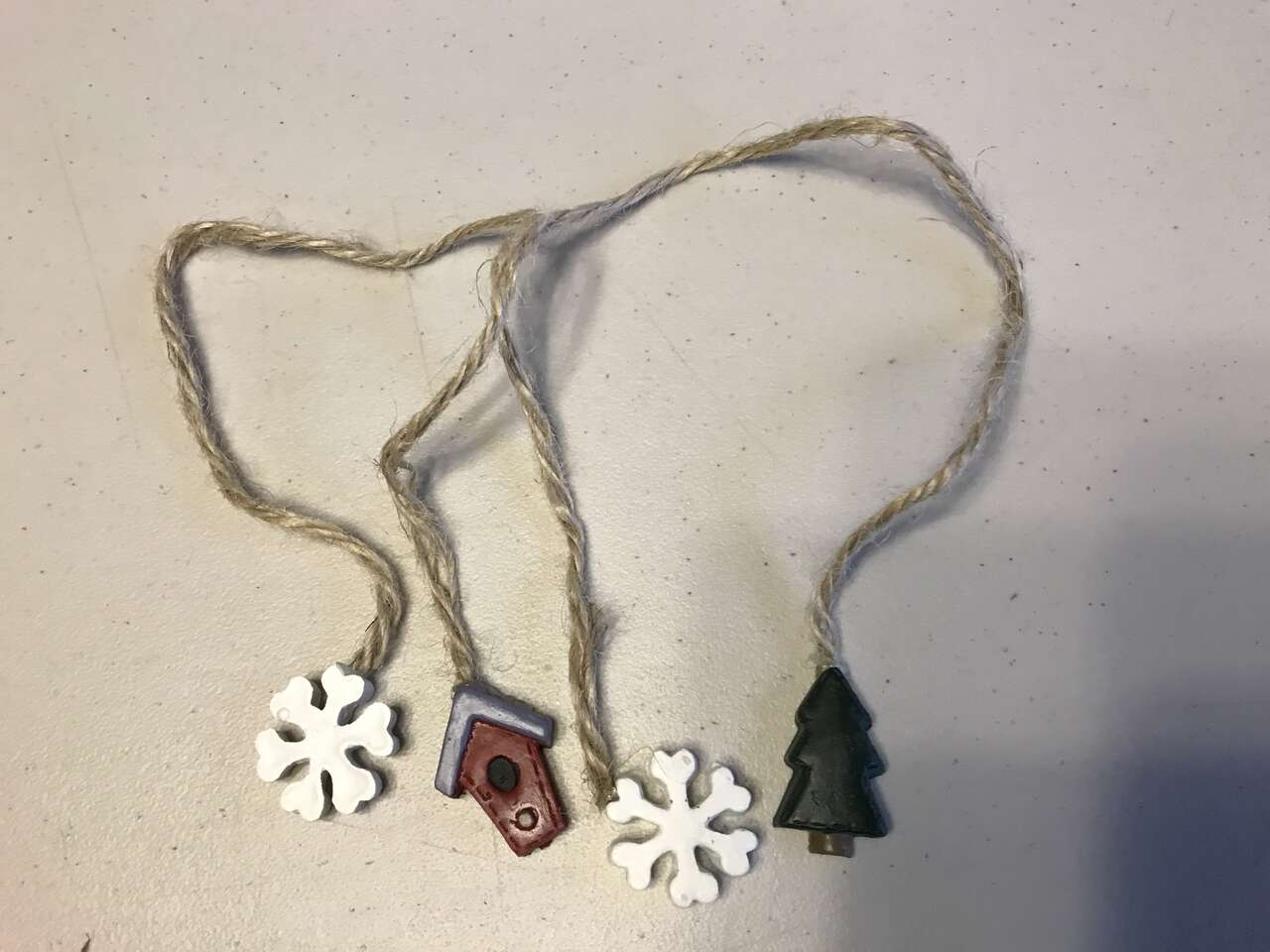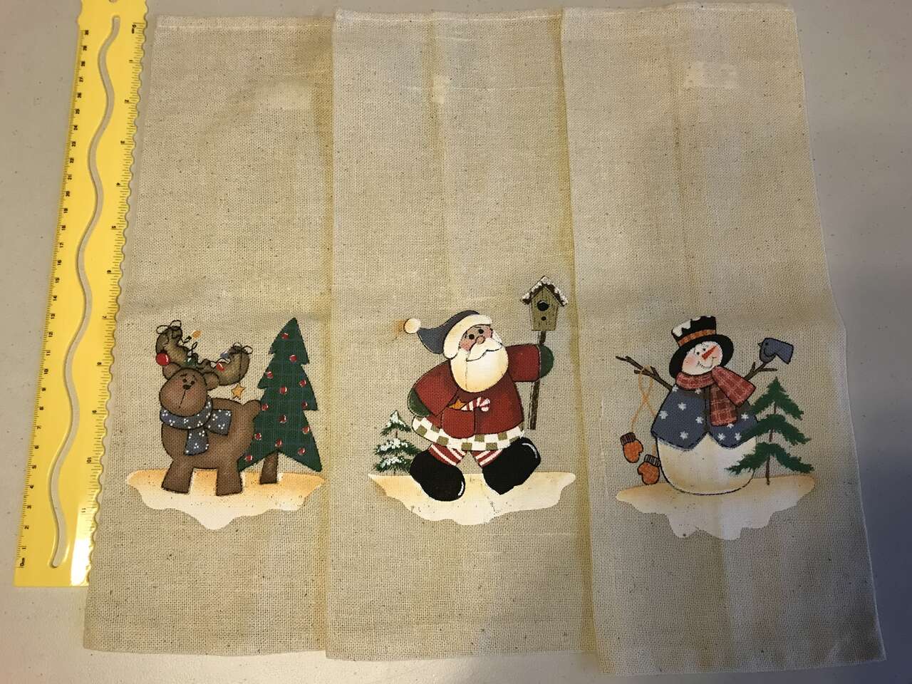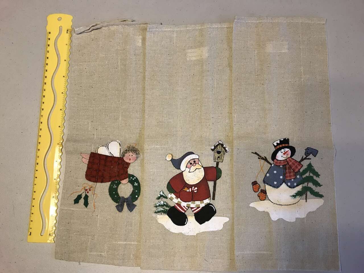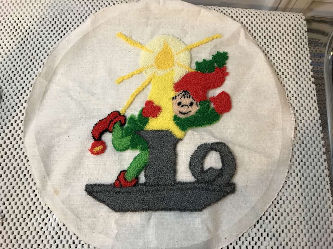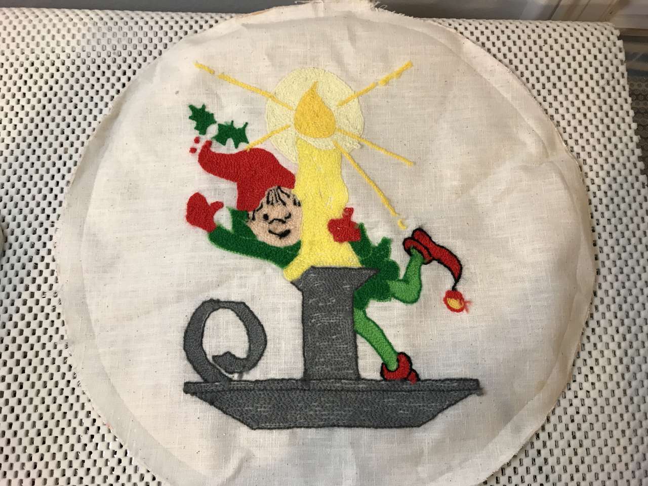 Elf Hiding behind Candle stitchery Can be made into a pillow. Used to be in a hoop. Also included is the JOY Macrame Handmade Door Knob Hanger, approximately 21" Long, used, and 2 Noel Plastic Canvas Handstitched Wall Hangings red green and white and 1-10" wood hoop. $10.00