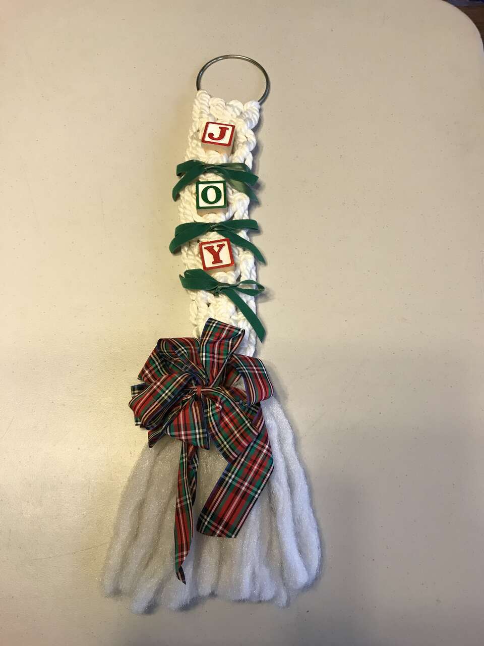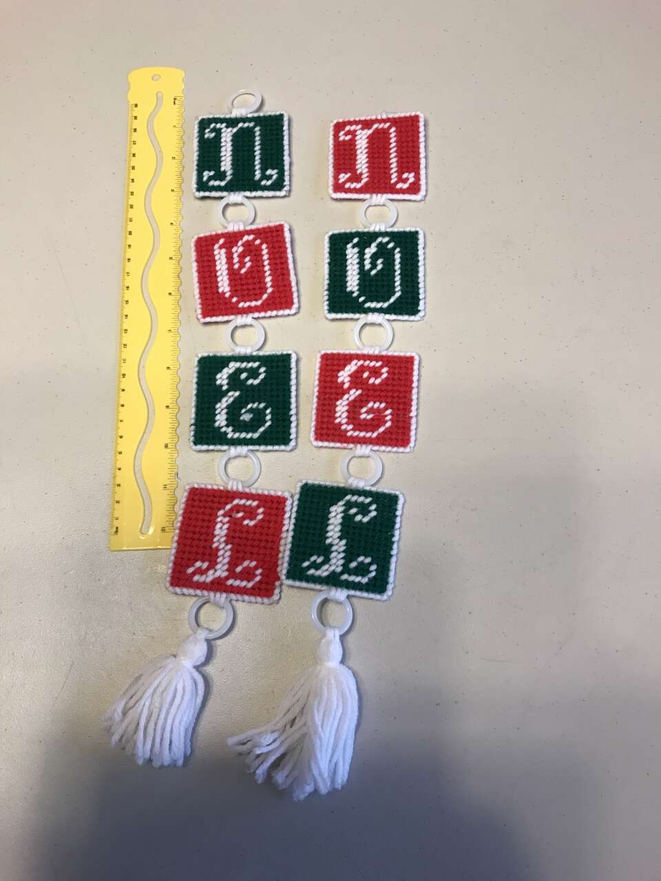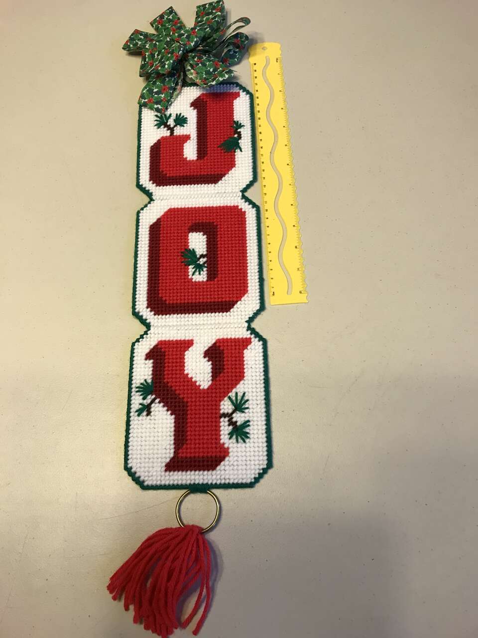 Joy Wall Hanging Plastic Canvas By Herrschners Inc., about 22" x 5 1/4" handmade, $10.00