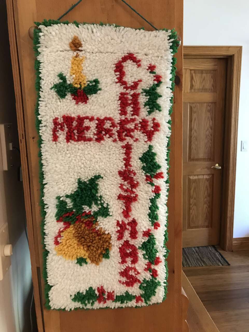 Vintage Merry Christmas Completed Latch Hook 27"x12" Holiday Rug Wall Hanging Bells and Candle design. $10.00