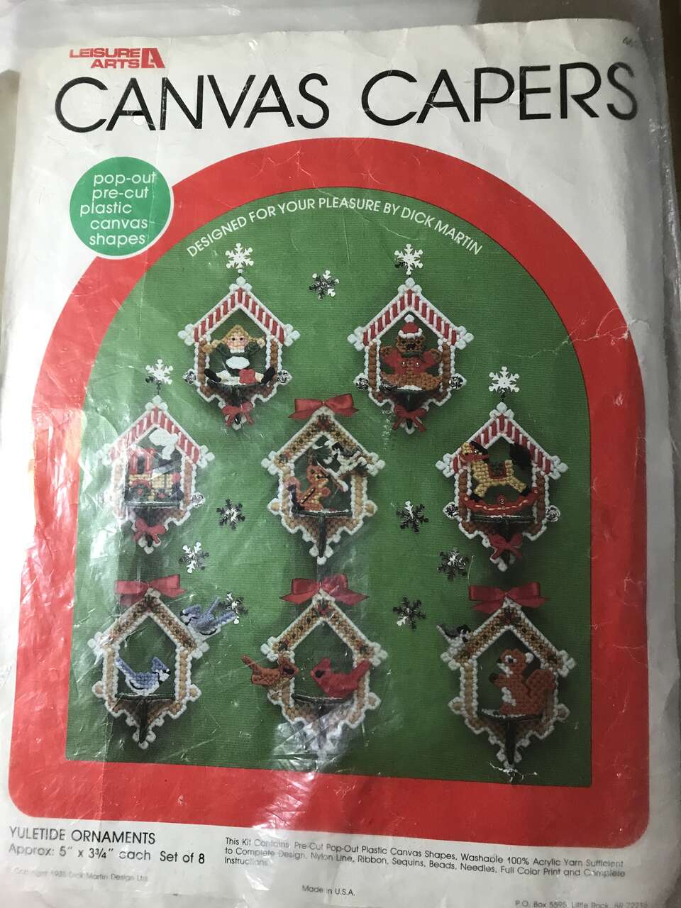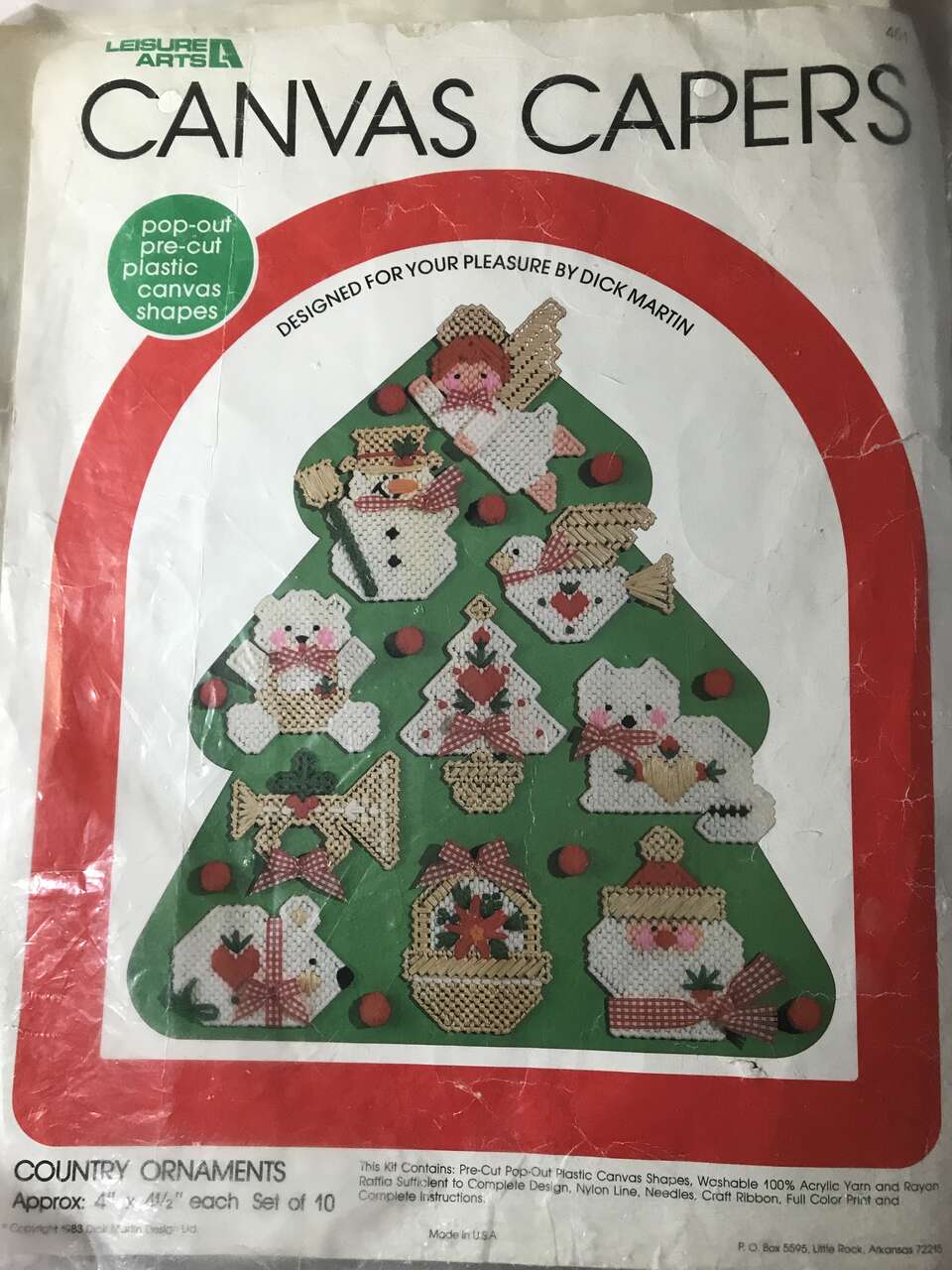 Canvas Capers Yultide Ornaments Instructions and colored pictures only and also Canvas Capers Country Ornaments Instructions and colored pictures only and 3" Embroidery hoop, red ring $10.00