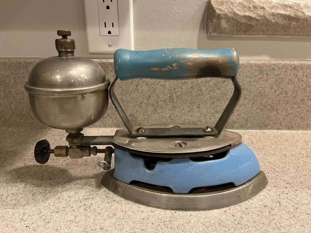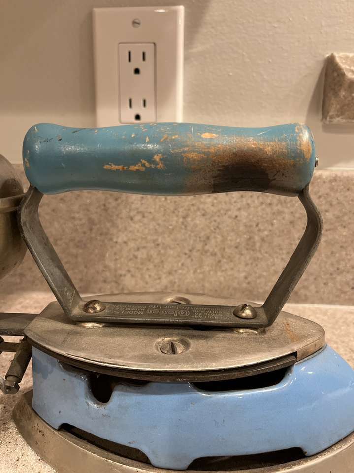 Coleman manufactured this gasoline iron from 1929-1948. Color is “cool blue” enamel. Iron is in great shape for its age. Some signs of wear and there is a char mark on the handle.