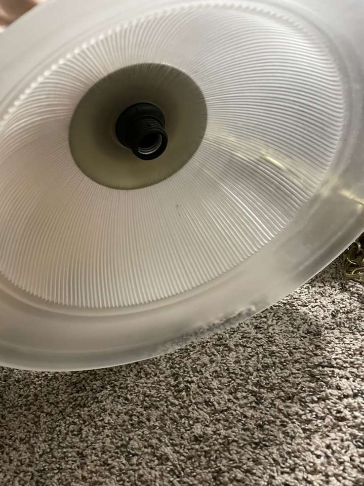 Large pendant light fixture. Gold/brass, and frosted glass. Used with a nautical theme, but changing up the decor.