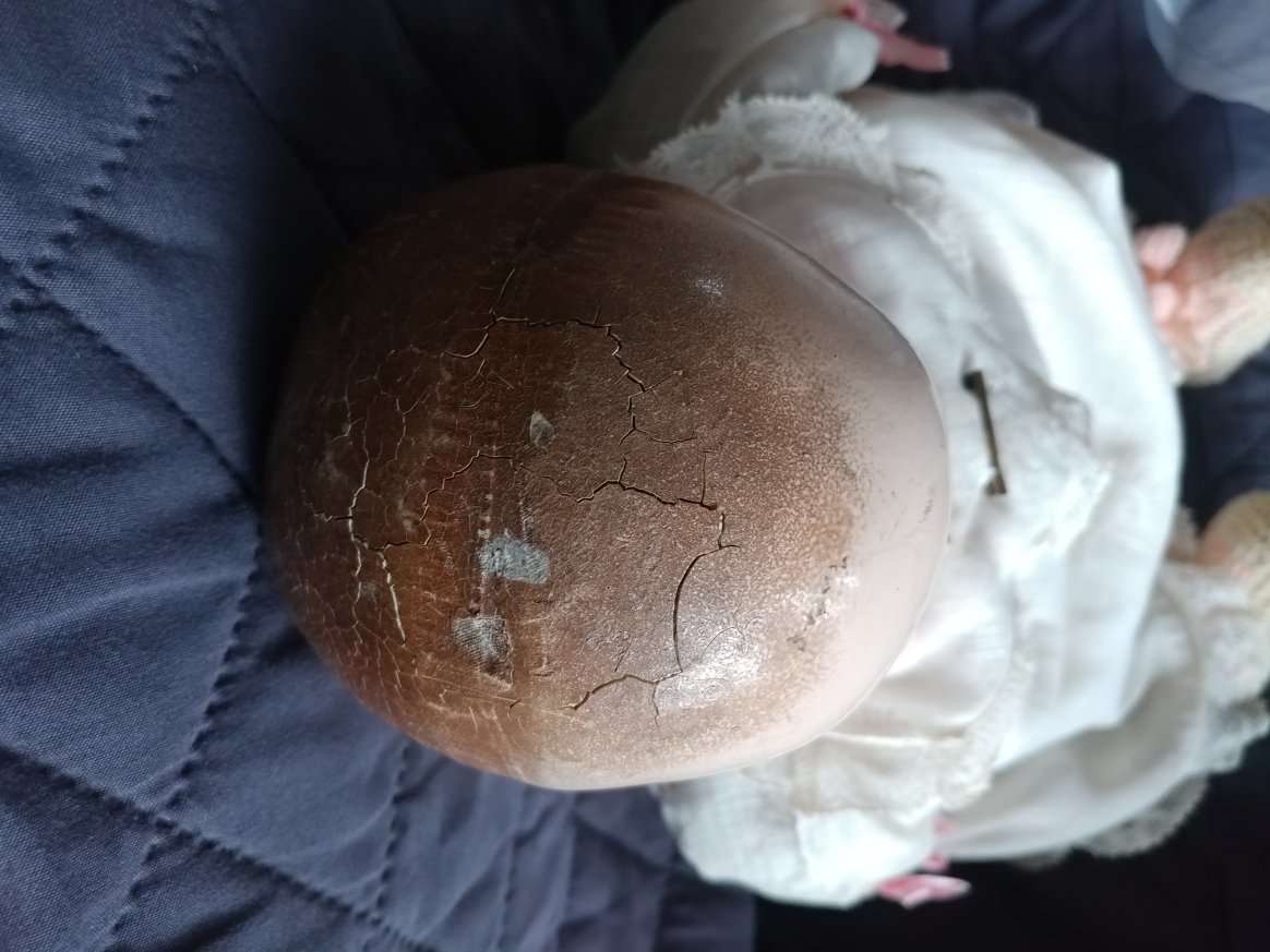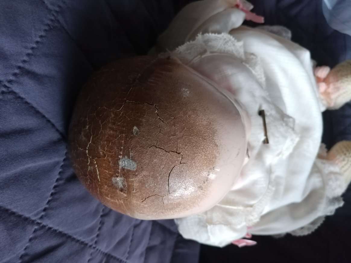 This is a 1918 cloth baby doll. Thebody has an ink stamp that reads: "Madame Hendren Life-Like Doll, Patented June 11, 1918. It has molded painted hair, painted eyes and mouth. This is the first Baby doll created by Georgene Averill, who is known as a Mama doll. It has a scratched nose and a fracture on top of its head. Wornpaint on finger tips. Everything else is intact. 16-17 inches in length.