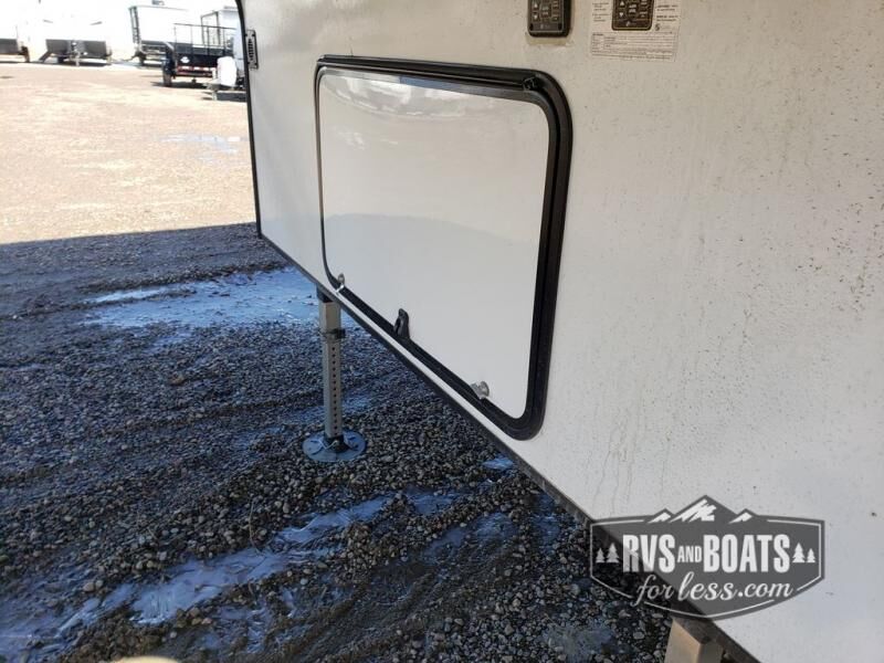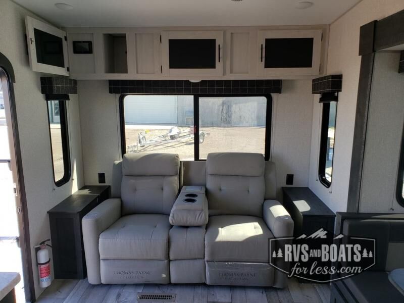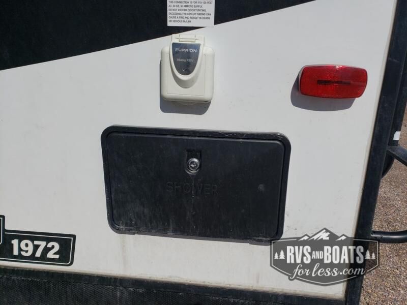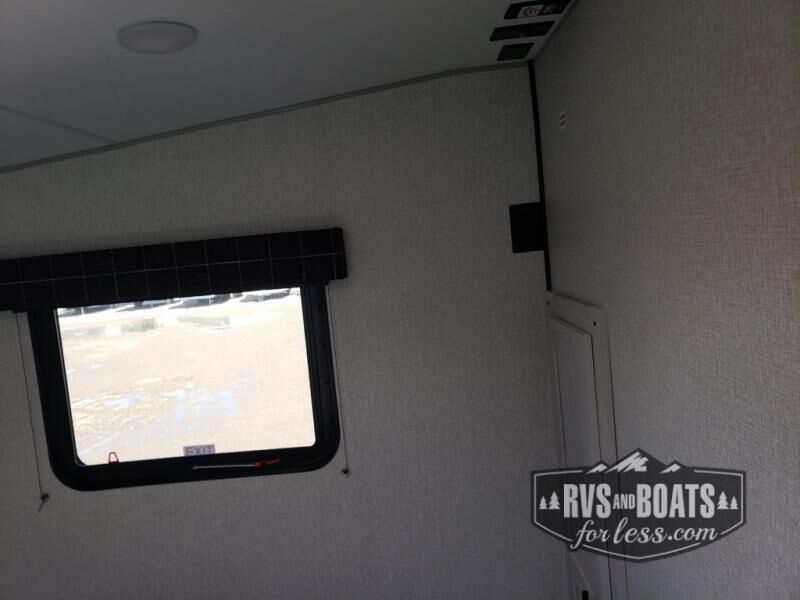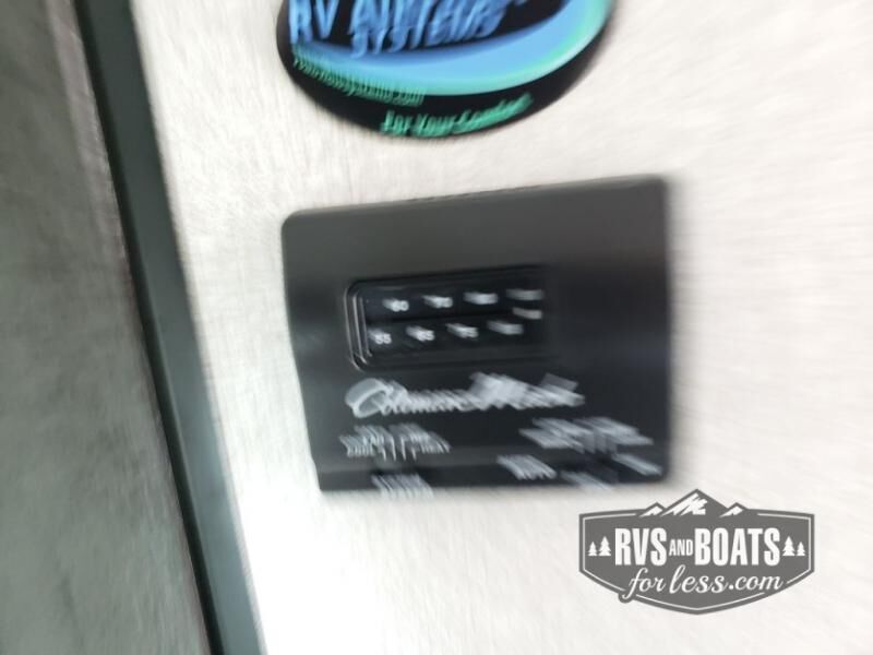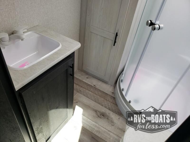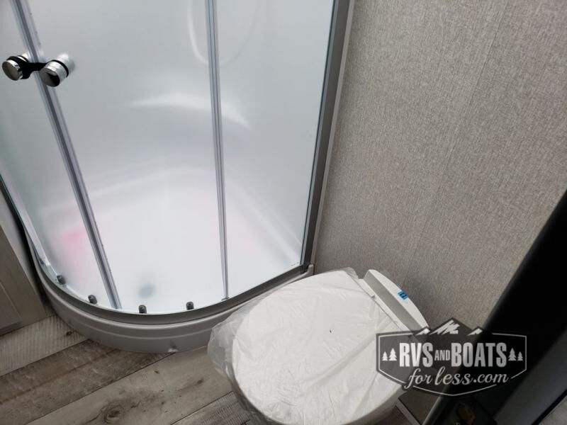 You will have everything you need for a comfortable camping trip in this fifth wheel! The rear living area has a 70" tri-fold sofa with end tables to set your bowl of popcorn that you popped with the microwave. You can add the optional 30" fireplace to the entertainment center for a truly relaxing evening indoors. Enjoy your meals, play card games, and even transform the 42" booth dinette into an extra sleeping space. Inside the full bathroom is a radius shower with a linen closet next to it to keep your towels close. The exterior pass-through storage area has plenty of room for you to bring all of your outdoor gear!