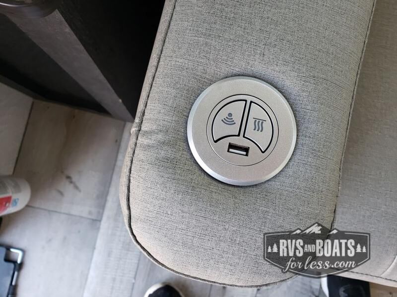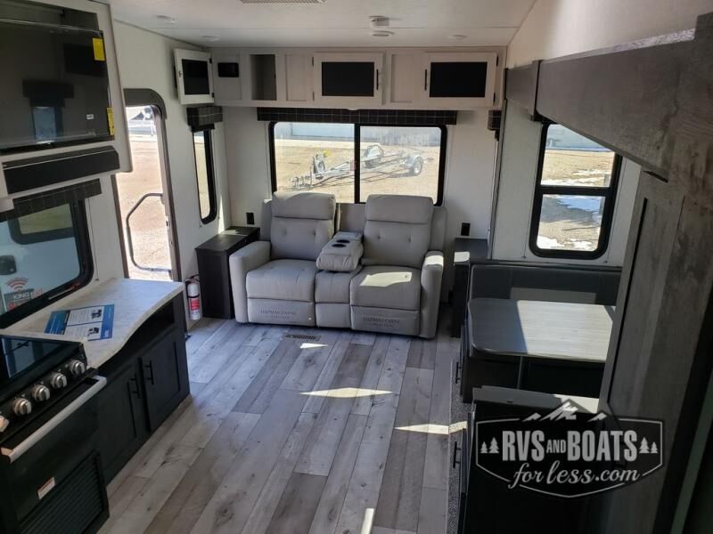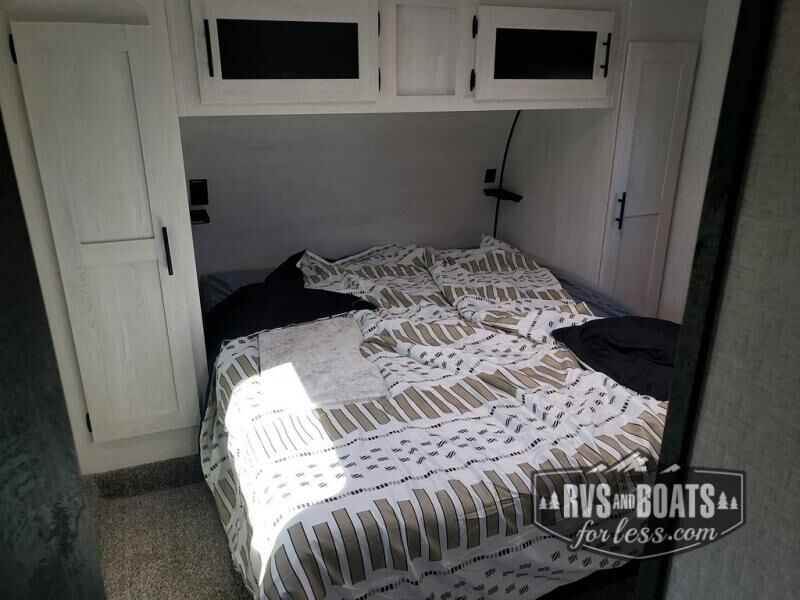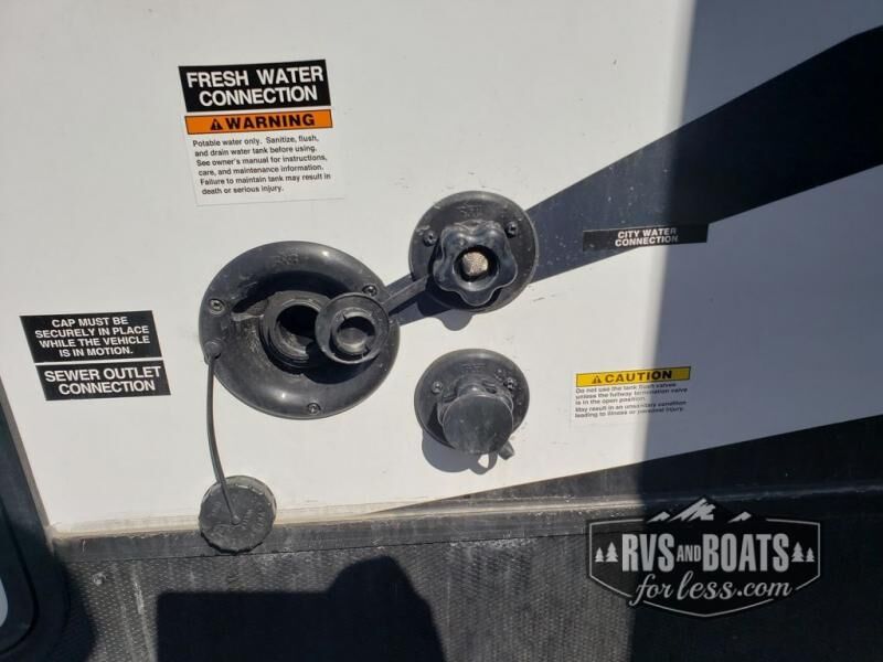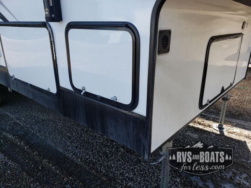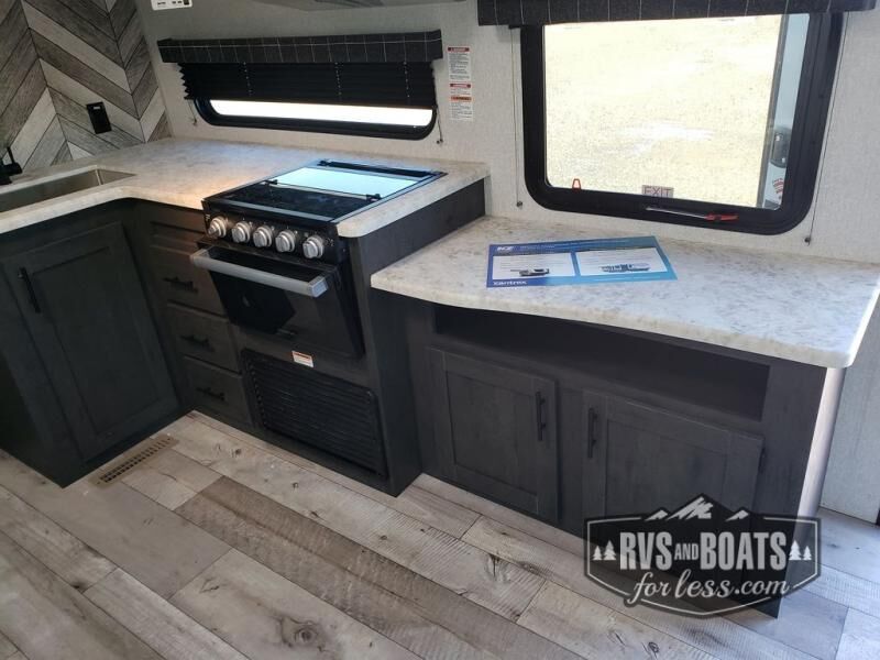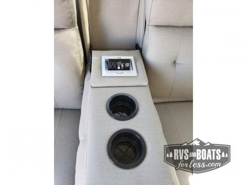 You will have everything you need for a comfortable camping trip in this fifth wheel! The rear living area has a 70" tri-fold sofa with end tables to set your bowl of popcorn that you popped with the microwave. You can add the optional 30" fireplace to the entertainment center for a truly relaxing evening indoors. Enjoy your meals, play card games, and even transform the 42" booth dinette into an extra sleeping space. Inside the full bathroom is a radius shower with a linen closet next to it to keep your towels close. The exterior pass-through storage area has plenty of room for you to bring all of your outdoor gear!