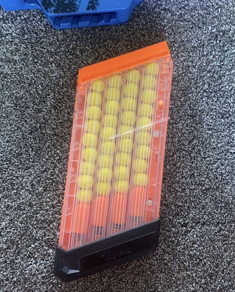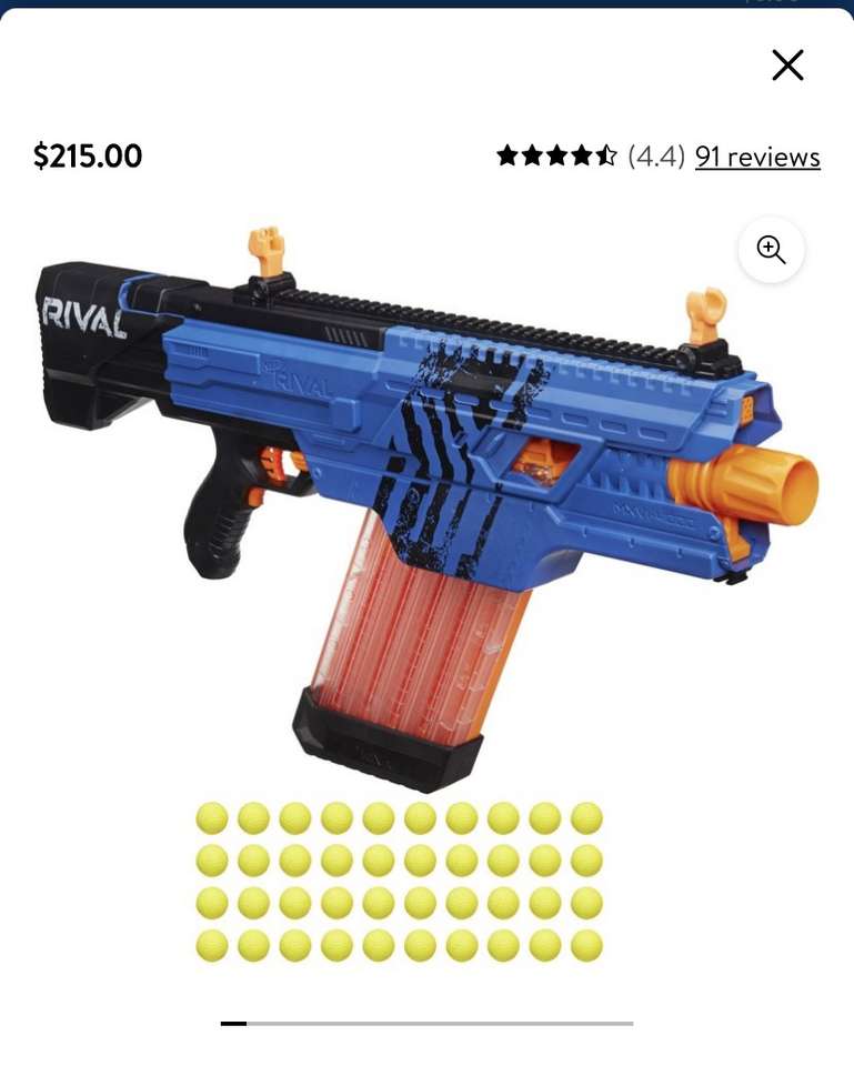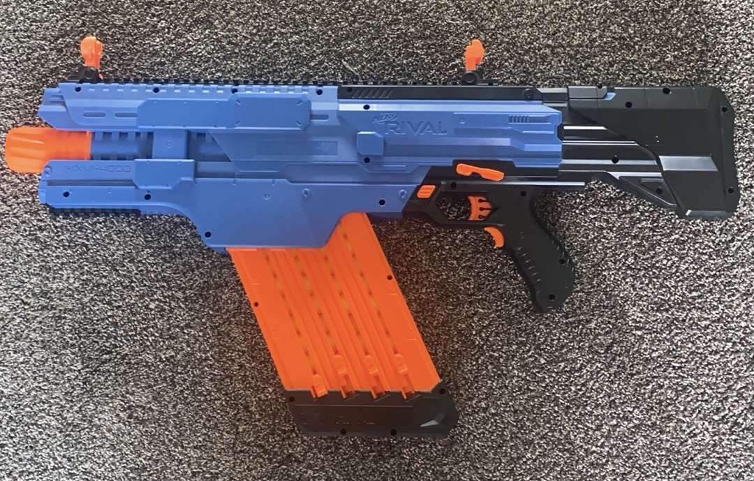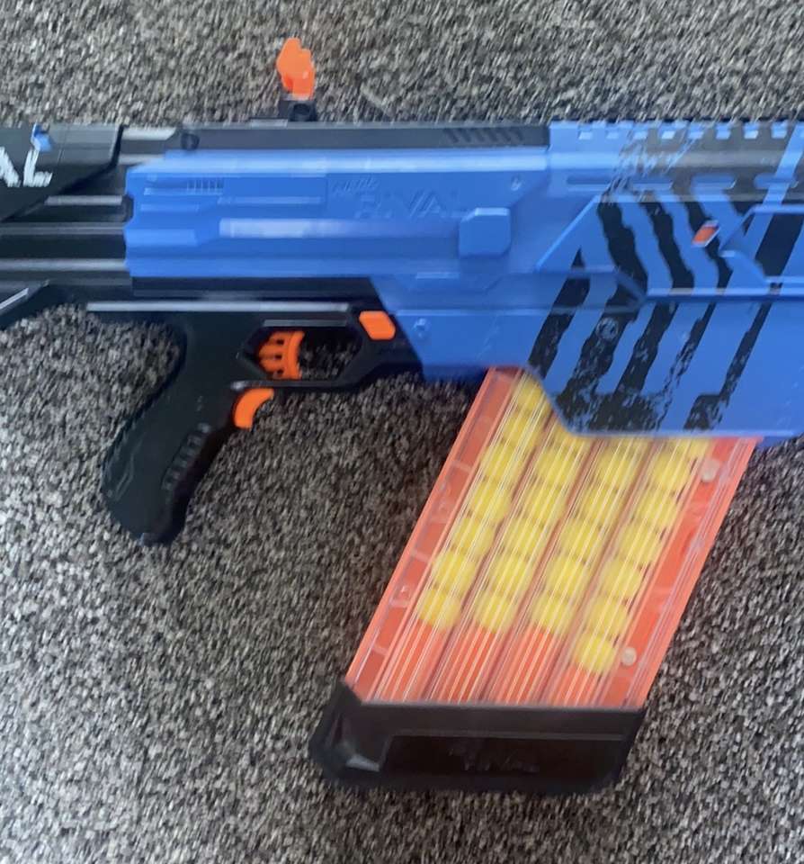 Nerf Rival Khaos MXVI-4000 Blaster (blue) with magazine and ammo in great condition. Rapidly fires 40 high impact rounds at a max of 100 fps velocity. Only used a couple times. New online for $200. Requires six D batteries (not included). $75, cash only please.