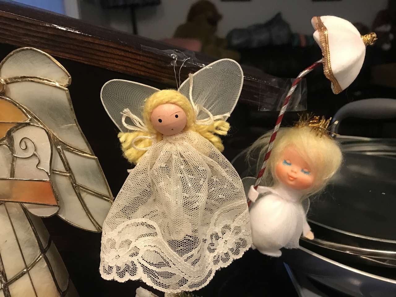 VenmoVINTAGE ANGEL ORNAMENTS & STATUES. See all 3 photos for details & condition. 12 inch tall x 9 inch wide wooden, tole-painted standing Angel. Country-style Soft padded Button Angel hanging ornament with green & red wings, 5 inch wide x 8 inch tall. 4 Plastic ornaments, c1950-1960 - Tummy Cupid w/wreath halo, Wood-painted head Angel hanging ornament with Lace Wings & Dress, One turquoise feather angel ornament. $8 for all. Cash/Venmo. In Sandy. 801-201-5350.