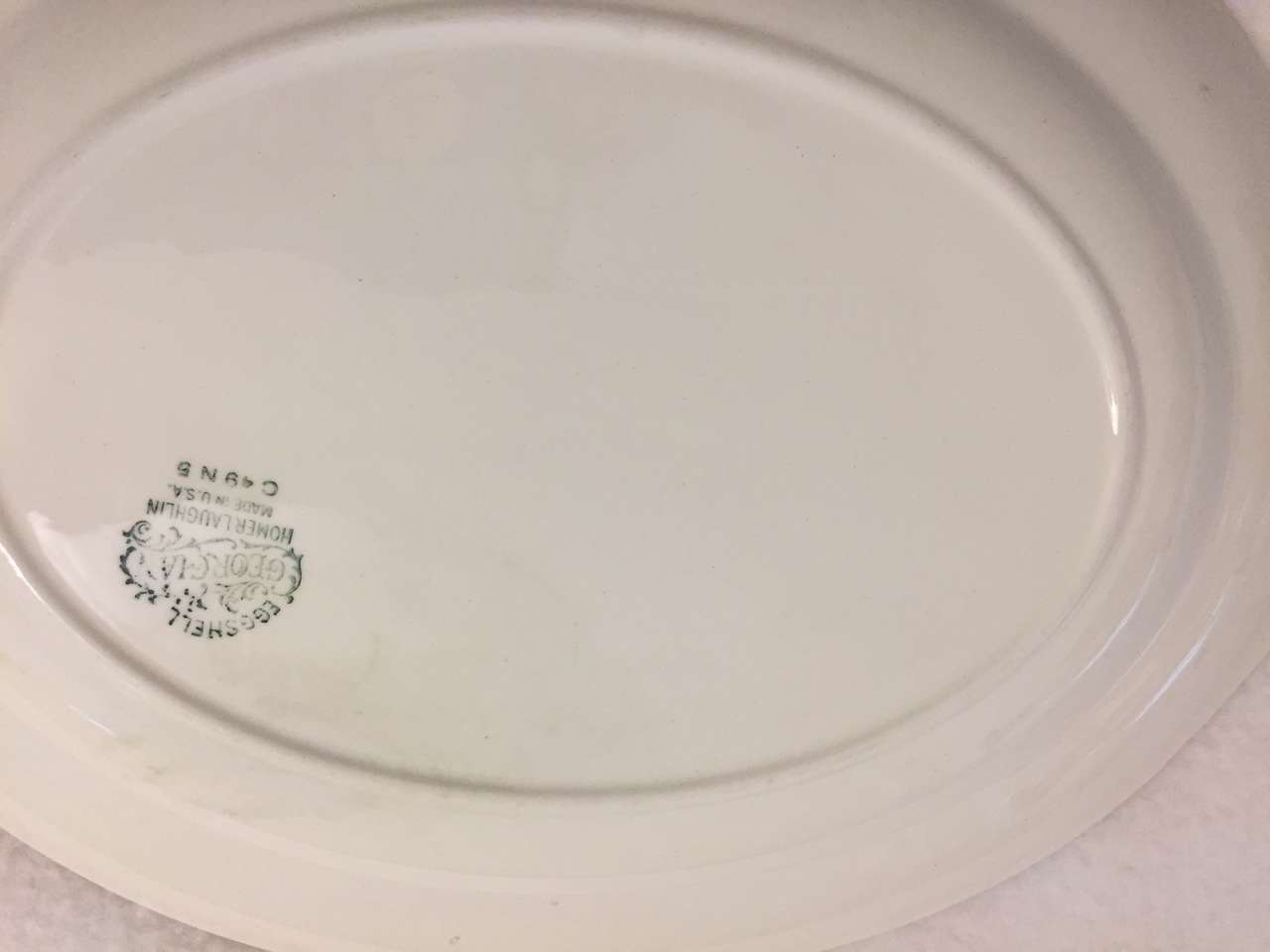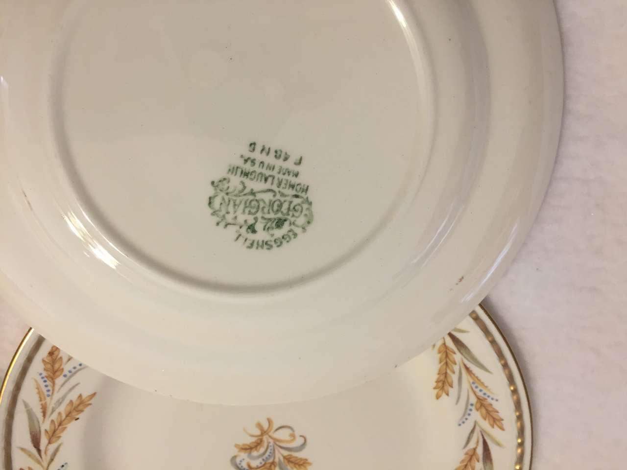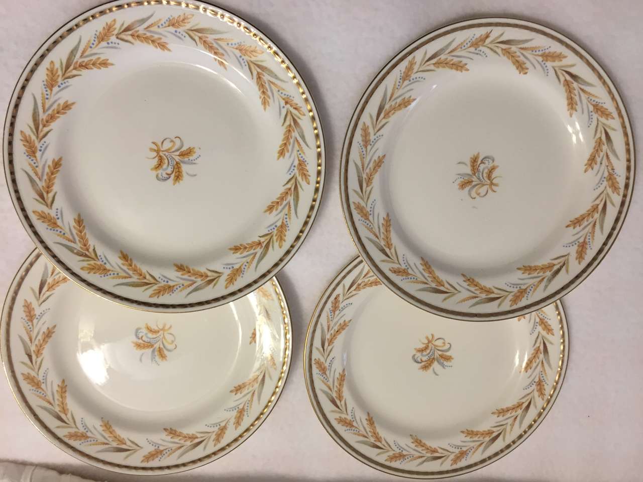 This listing is for a handled oval platter about 12" across and 4 small dessert plates in the Homer Laughlin Kingston pattern. Beautiful wheat decoration trimmed in gold. Two pieces have very small chips on the bottom side, the platter with 3 and one plate with 1. Ca. 1946 -.