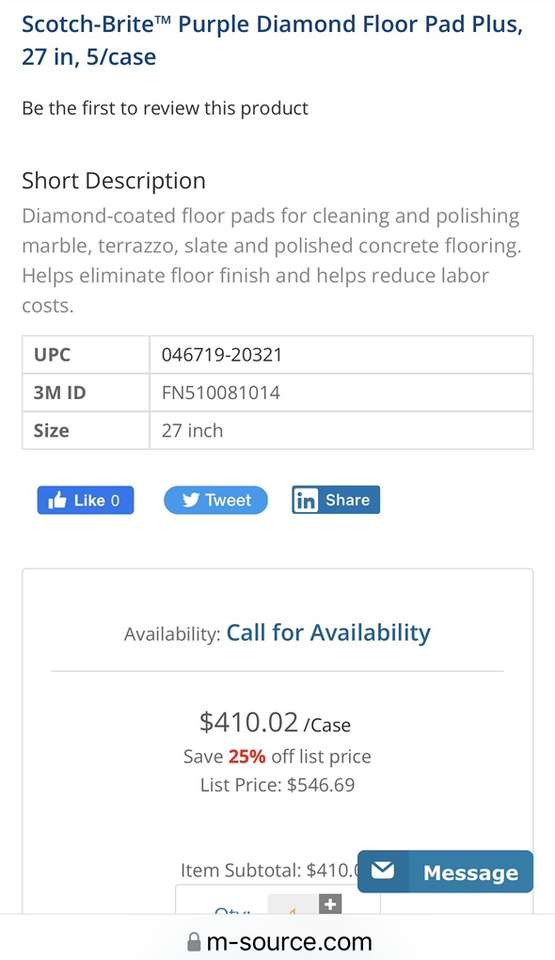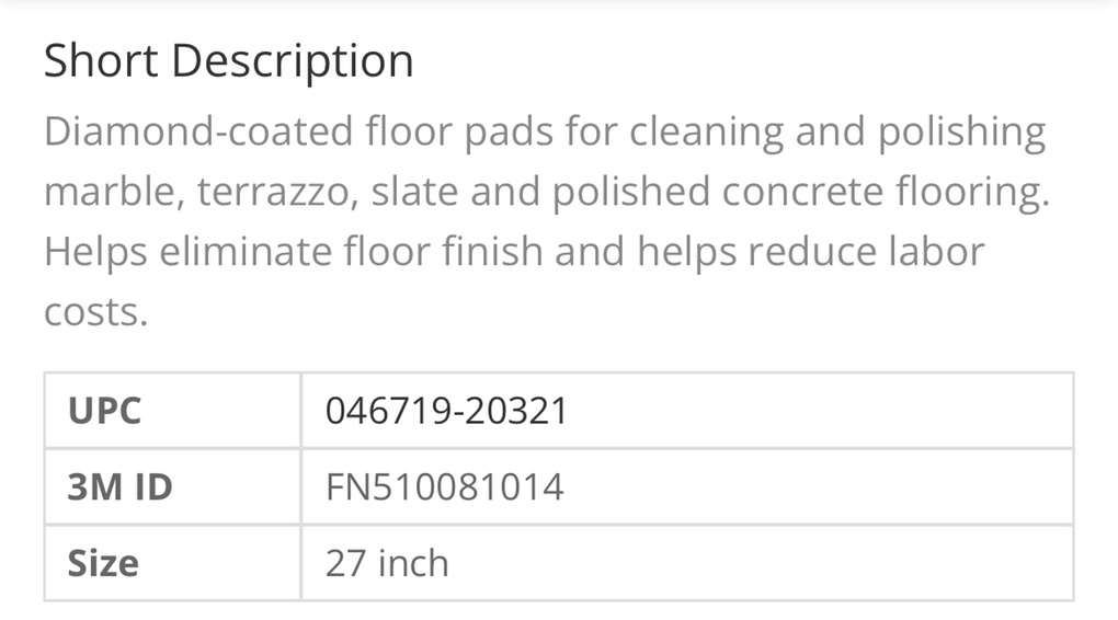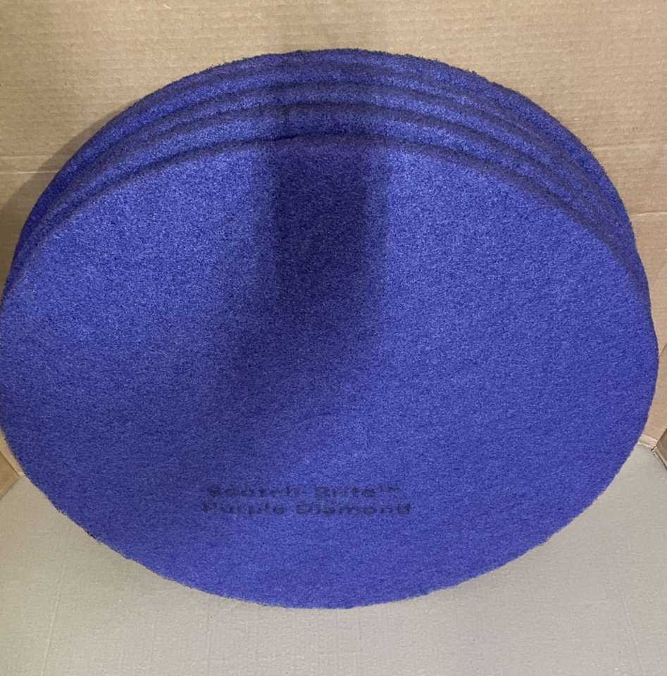 Description- Case of 5 Scotch-brite purple diamond floor pads plus. These are diamond coated floor pads for cleaning and polishing marble, terrazzo, slate and polished concrete flooring. Helps eliminate floor finish and reduces labor costs. See photos for more product information and specifications.