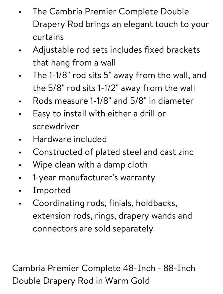 Description- Premier complete 48-88” double curtain rod set in warm gold. See photos for more product information and specifications.