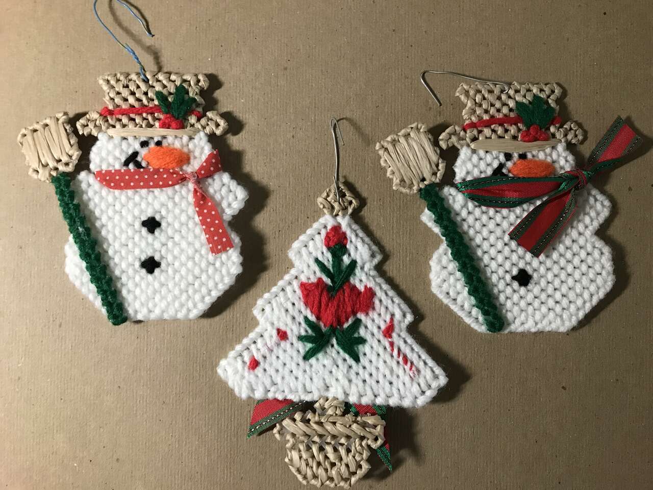 3 - Plastic Canvas needlepoint ornaments. Snowmen at 4" high and tree is 4 3/4" high.