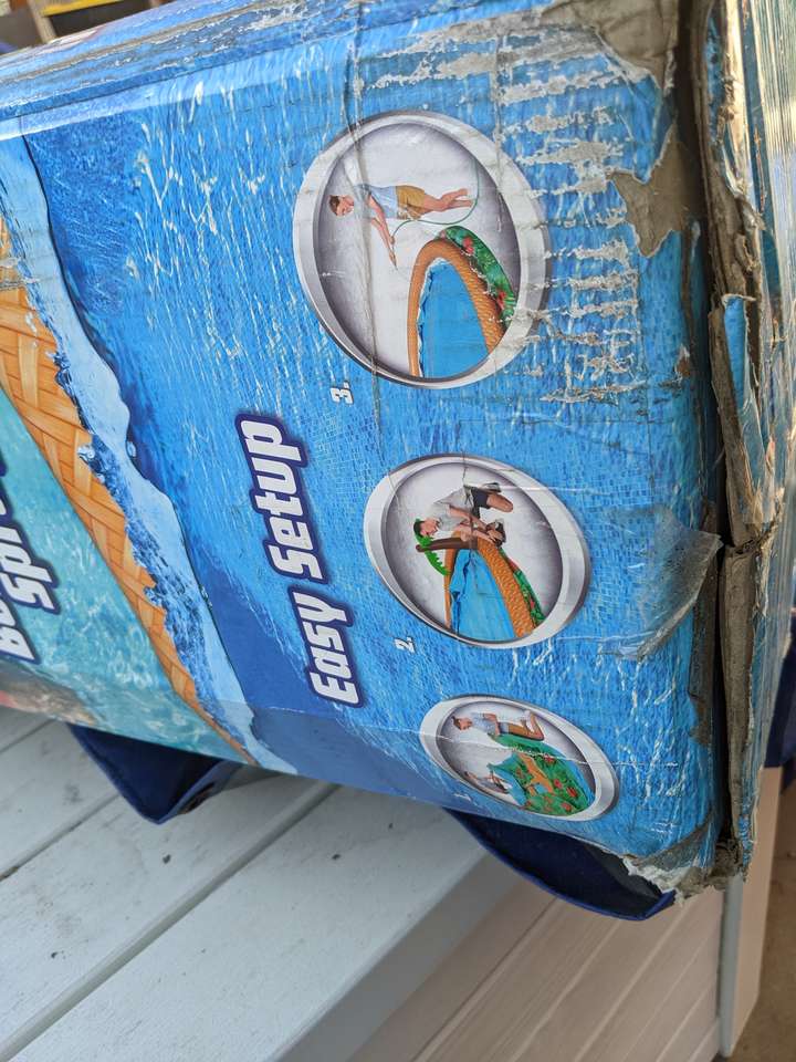 PALM TREE SPRAY: Includes an inflatable palm tree that sprays water when connected to a garden hose; Assembly usually takes only 10 minutes with 2-3 people