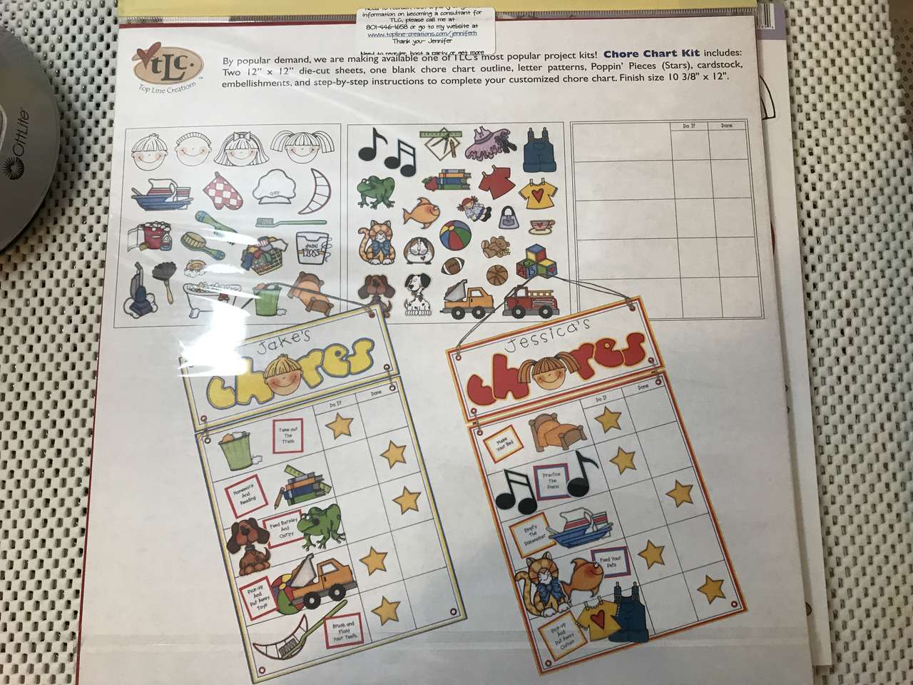 Chore Chart Kit includes 2 - 12"x12" die-cut sheets, one blank chore chart outline, letter patterns, Poppin' Pieces (Stars), cardstock, embellishments, and step-by-step instructions to complete your customized chore chart. Finished size 10 3/8" x 12". 2 kits available, price is for 1 kit.