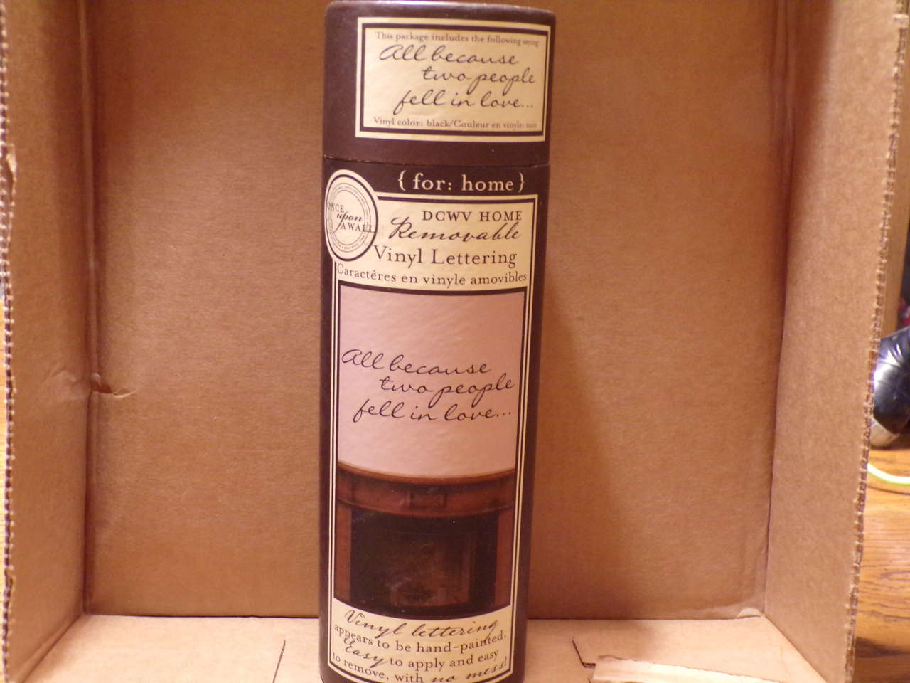 New in tube. Includes instructions and applicator. 30 wide x 11.75 tall. Made by DCWV Home. The saying is:All because two people fell in love.
