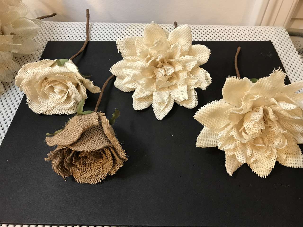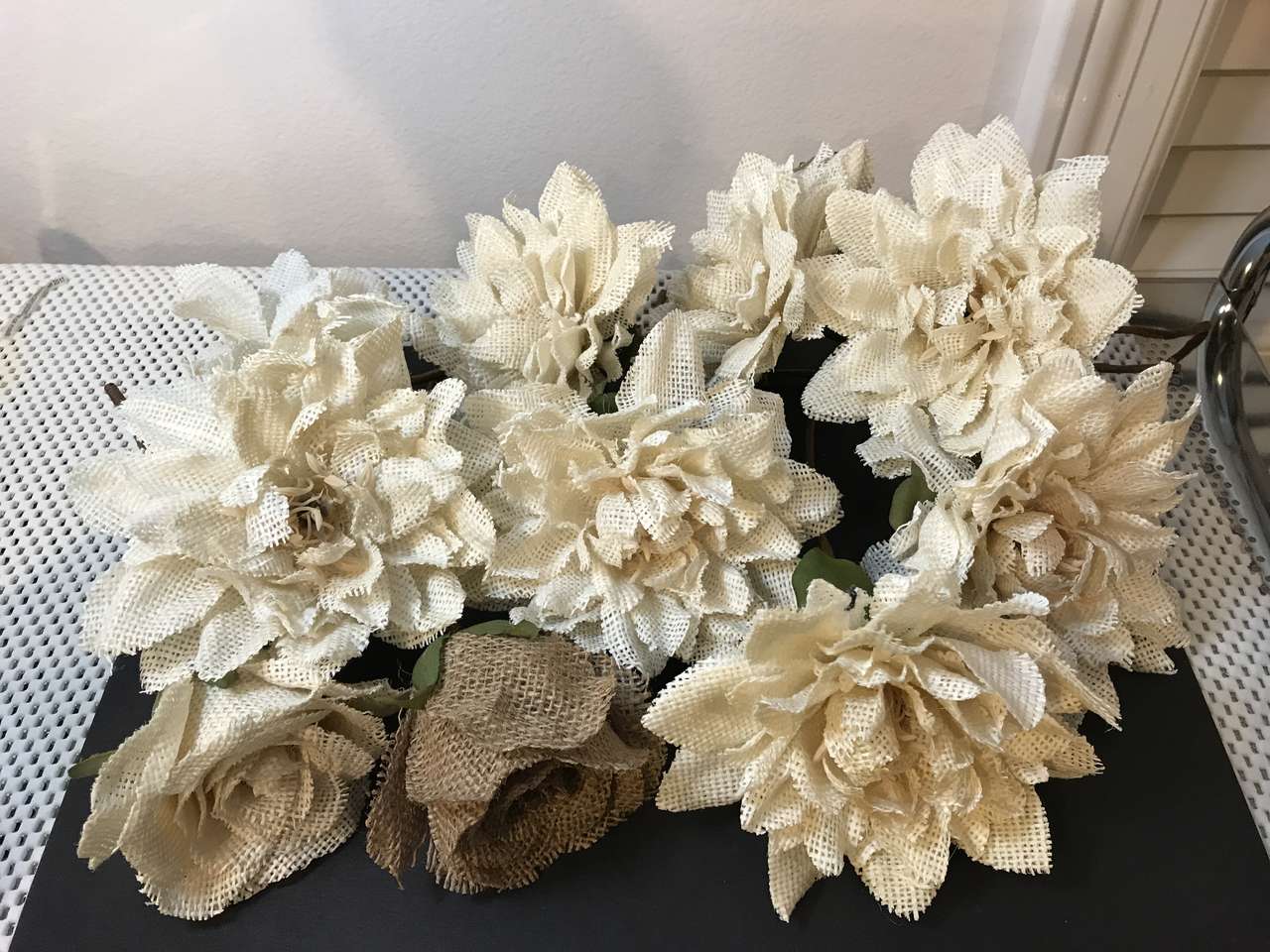 10 Burlap Flowers, $10.00 for 5. Choose the ones you want. Great for a Bridal Bouquet, New 1 ivory rose, 1 brown rose and 8 ivory fully bloomed flowers