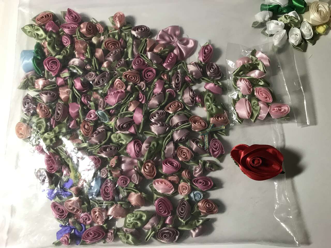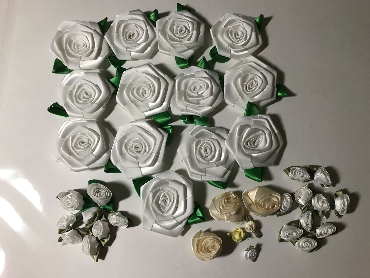 Large lot of Satin Ribbon Rose Flowers. Large white rose flowers are about 2 1/2" not counting leaves. Great for a summer wedding. Also includes sunflowers. See last 3 pictures. $10.00