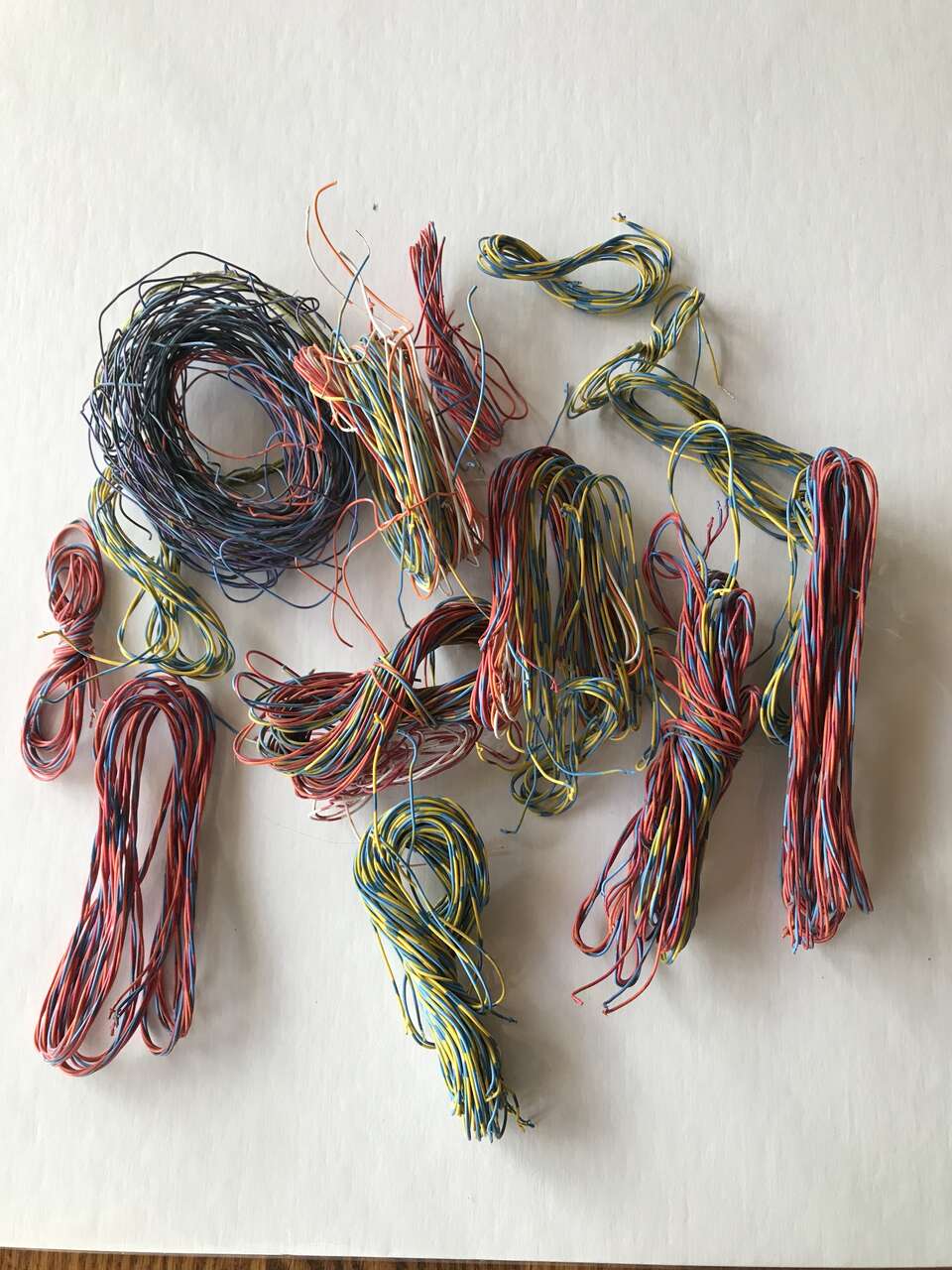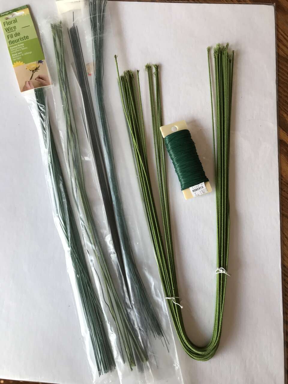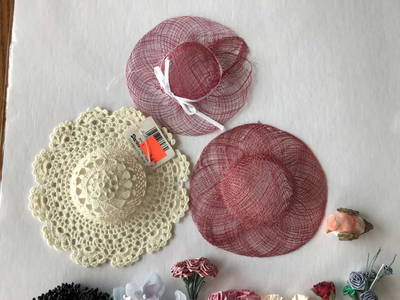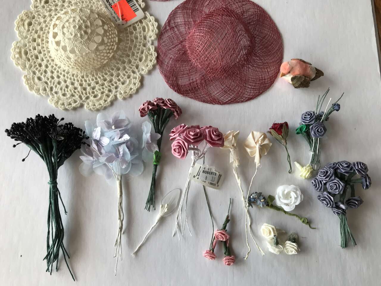 Floral Wire different guages - 26, 24, 20. I do not know fabric backed wire guage and Fuzzy Sticks pack of 100 Pipe Cleaners for Kid Crafting, opened but new. Contains red, green dark brown, tan and white colors with instruction for making turkey on front of package, and Lot of tiny flowers and 3 miniature doll hats. Crocheted hat 6" in diameter. and Telephone wire to use for bracelet art craft, $10.00
