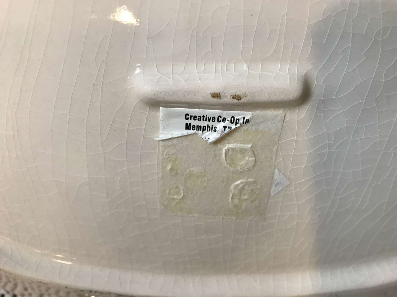 The Country Farmhouse Ceramic Platterby Creative Co-Op features an oval shapewith a glossy finish 15”x11”. This is a very beautiful platter which showcases a charming apples/fruit theme to display in your Home. There are no chips or cracks. There is crazing on the surface of the cream colored part of the platter. I would not use it for serving moist foods.