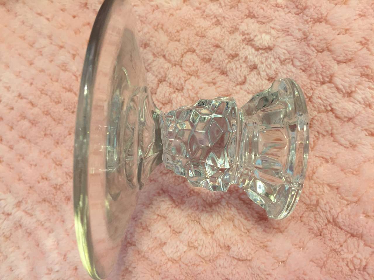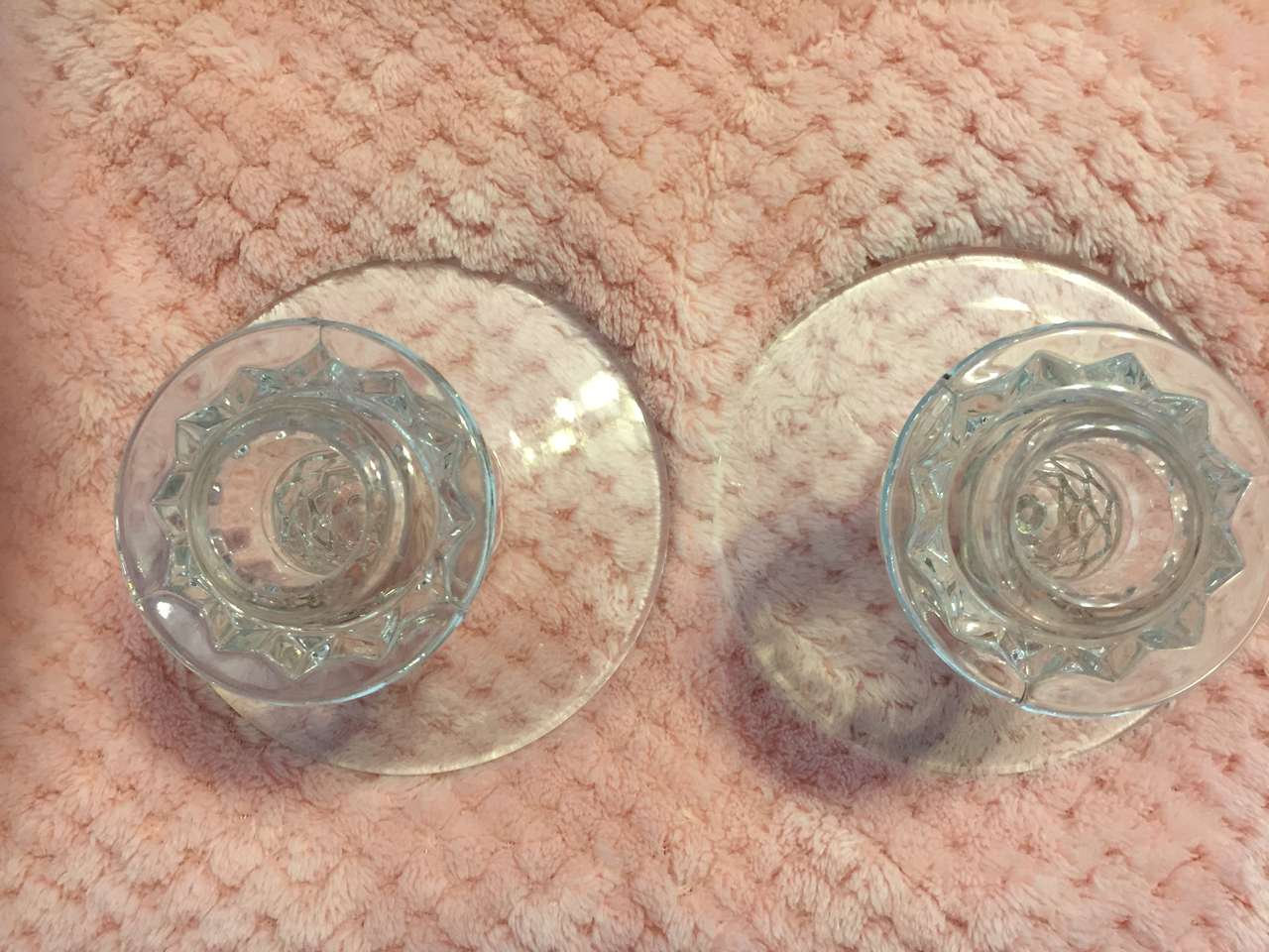 This listing is for a pair of candlesticks made by Fostoria in the pattern American. They are clear quality glass with a cubist pattern, about 4.5" across the base, in excellent condition.