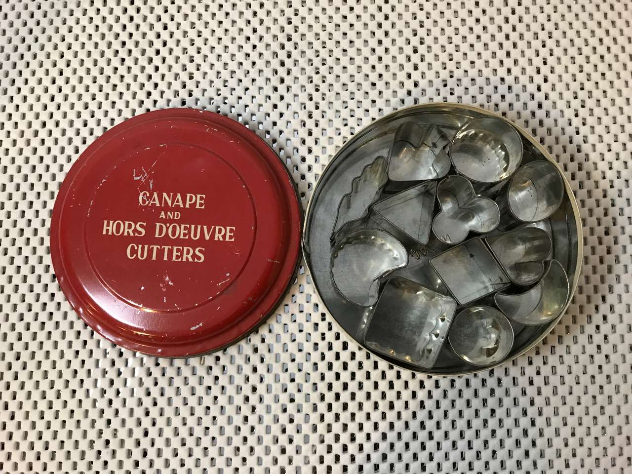 Vintage Canape Hors D'Oeuvre Cutters mini metal cookie cutters, set of 12 in tin can, made in Japan, $10.00