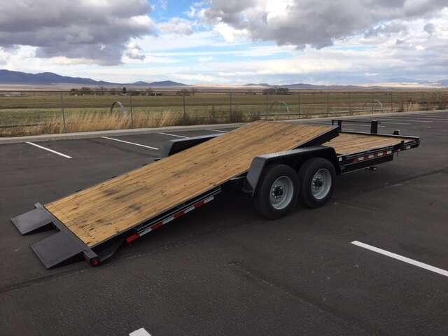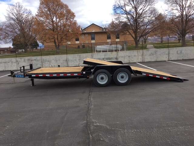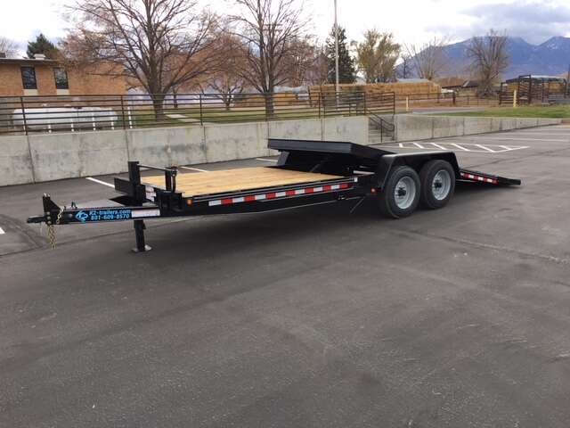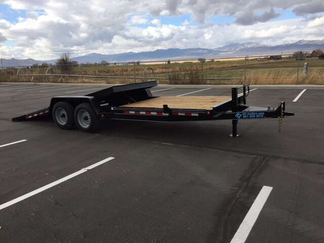 This 17000 GVWR Deluxe Wood Floor Tilt Deck Equipment Trailer is a popular trailer. Our Customers love how this trailer performs and travels down the road with a load.. Like all our other Deluxe models is fully equipped with all our best features. A heavy duty running gear package with heavier oil bathed axles, tires, and a super duty cast iron coupler are the key features. The running gear features 8,000 lb. 8 lug axles with heavy duty 14 ply, load range G radial tires and heavy duty slipper spring suspension. The coupler is a super duty three bolt cast iron unit. The frame is 6 in. channel with a 6 in. channel wrap around tongue. A tool box with a lockable lid, 16 in. cross-member spacing, stake pockets with a rub rail on the outside, and full reflective tape are all included. A US made sealed modular wiring harness with lifetime LED lighting assures trouble-free lighting on every trailer. 1 year Warranty See our other ads www.k2-trailers.com or find us on Facebook Call or Txt anytime Brian 801-472-1613 Chris 801-420-4076 Dealer 454A website: www.k2trailers.com Visit us on Facebook https://www.facebook.com/k2trailers/