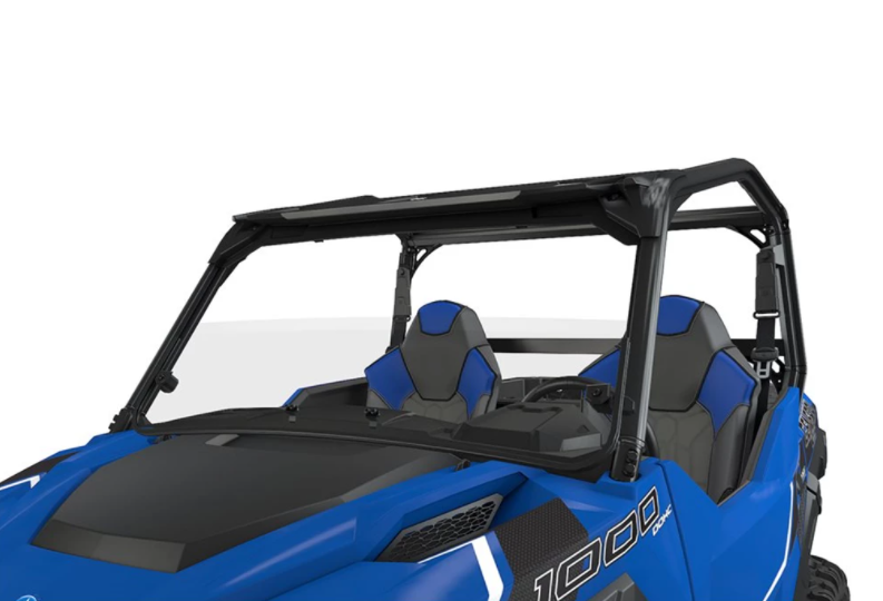 Gain the wind and element protection of a windshield and still retain the airflow you want for hot or dusty conditions. This Lock & Ride Half Windshield - Poly is constructed from rugged polycarbonate and is contoured to deflect debris, rain, and vehicle spray over the occupants, while still retaining a sporty look and adequate airflow. Can be installed and removed in just seconds using Polaris-exclusive Lock & Ride quarter-turn handles.