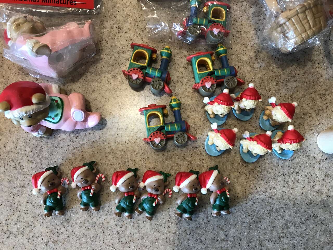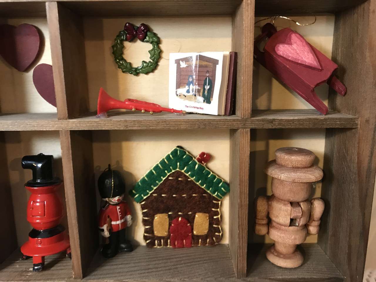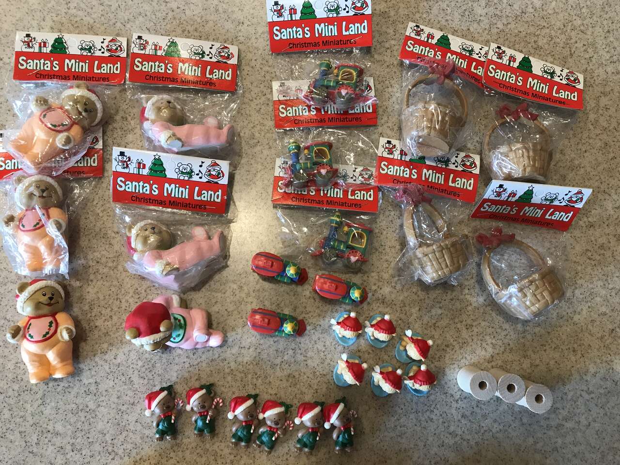 Rustic Shadow Box 7 Compartment Wood Hanging Rectangle Wall Shelf Storage Display Unit, Stained ready for you to decorate, 14" x 13" x 2 1/2", and Lot of Santa Mini Land Christmas Miniatures. Train is 1 1/2". All for and 14"x14" Christmas Theme Decorated Wood Mat Board for Displaying a 5"x7 Picture, New and Wooden figurines to be painted to go in a Shadow Box, and 59 Miniature 1" Long Round Clothes Pins 29 Red and 30 with String Line. and Lot of Miniature Dollhouse Baby figurines. and 8 Wood Nesting Shadow Boxes Open Solid Natural Wood Square Shaped 9", 8 1/4", 7 1/2", 6 3/4", 6", 5 1/8", 4 3/8", 3 5/8". They are 1/4" thick. They can be used to hang on the wall. Stack them on top of each other and make a square Christmas Tree. (not pictured) Mini Set of 7 Vintage Handwoven Mini Straw Baskets /Floral Raffia Trim – Rustic Decor dated 1996. Product of the Philippine Islands. Would be great for Barbie Doll House. The biggest baskets are 3" x 1 1/2" x 4 3/4" countint the handle. The smaller basket with handle is 3" x 3" the smallest basket with handle is 2 1/4" x 1 1/4". The basket without handle is 2 1/2" x 1 1/2". 1 package of Greenbrier Mini Willow Baskets 6 pieces. $75.00