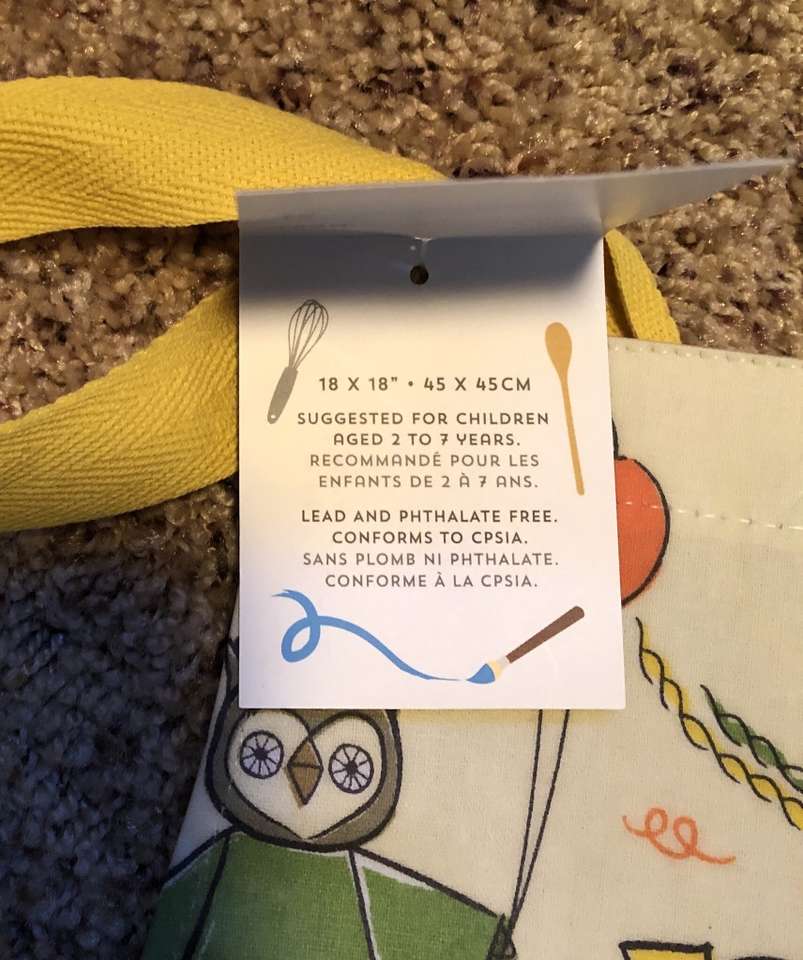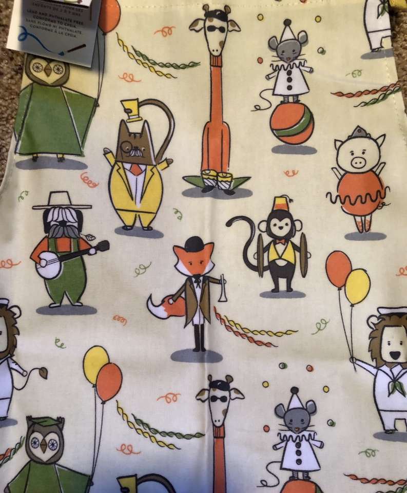 Never Used - Brand New - NWT Colorful APRON by Now Designs w fun cartoon animals: Jungle Jamboree pattern. Laminated sturdy canvas with adjustable neck strap & matching ties. Has 3 pockets lining the front of the apron. Great for painting, crafts, cooking, or sculpting, etc. 18” X 18” — 45 cm X 45 cm. Suggested for children ages 2-7 years old. Apron is lead & phthalate free. NWT: New with Tags. Photographs are of the exact apron you are purchasing. No defects or flaws.