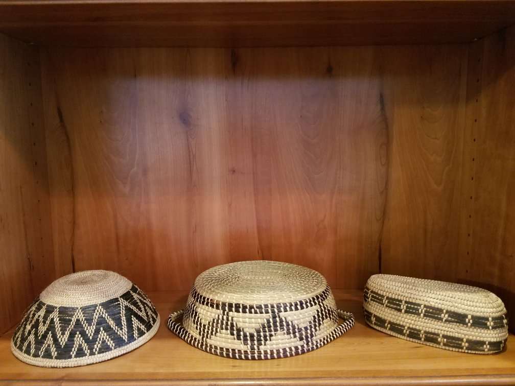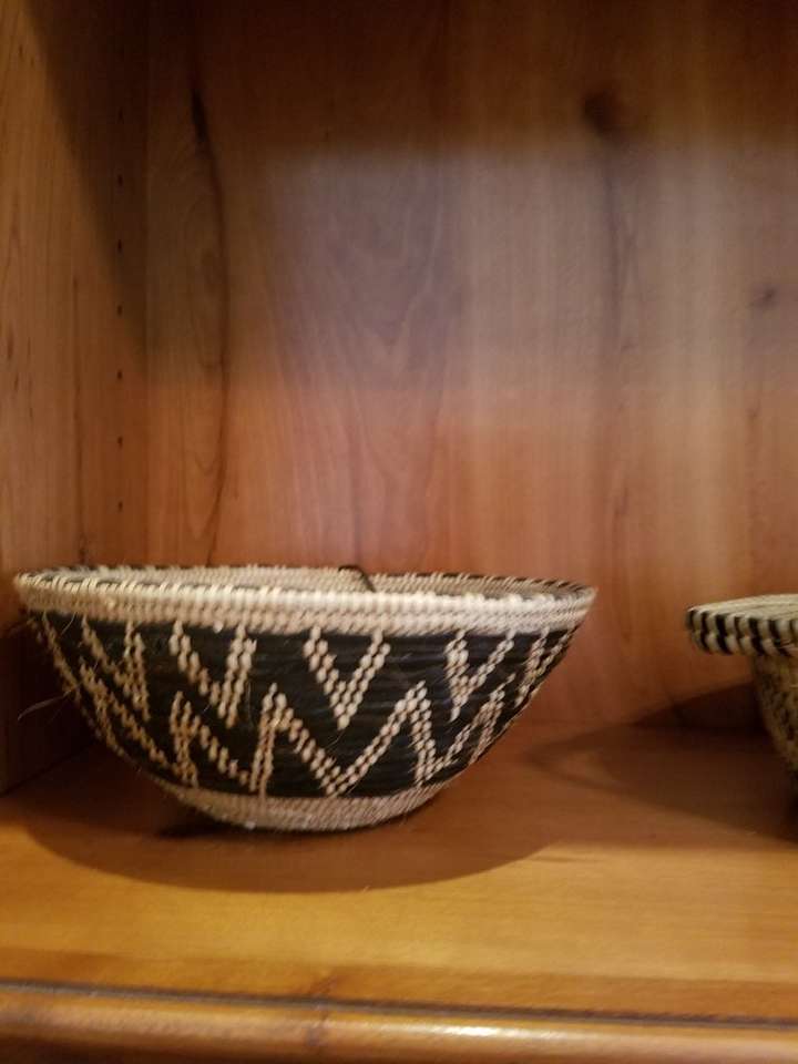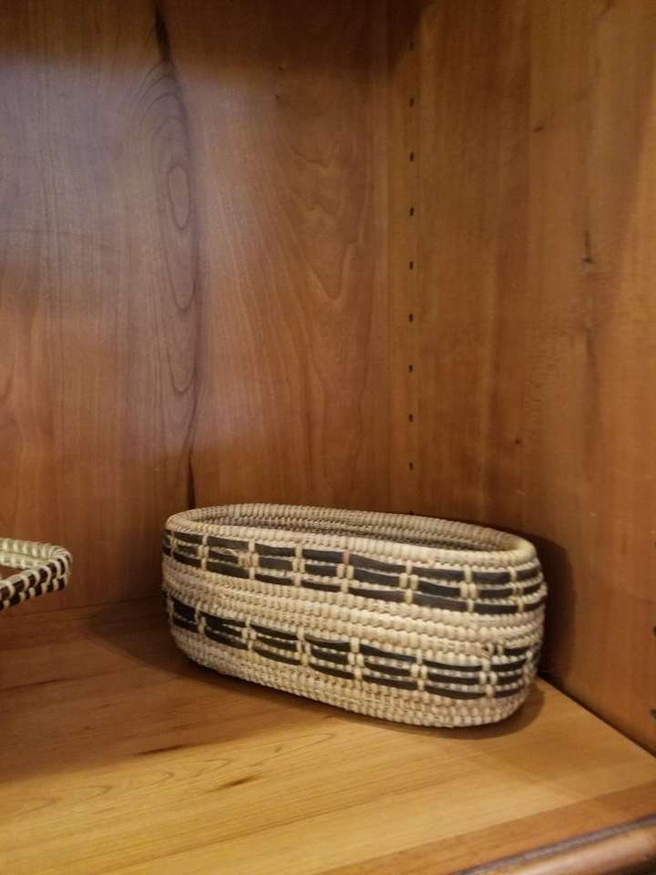 Two baskets with black leather woven into them from Oman in the Arabian Middle East. The first round one is tightly woven with strips of leather making a beautiful design. It is 8 inches wide, 3 1/2 inches. Price is $15. The oblong basket has dark brown sea grass woven to make a design. It is 11 inches wide, 3 inches high and 8 inches deep. $10. All have been used only for display, but they are perfect for bread or rolls, crackers or nuts. The small oval basket has been sold.
