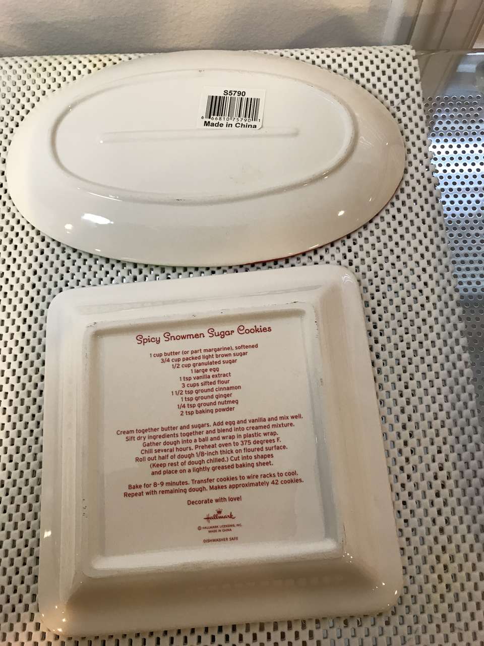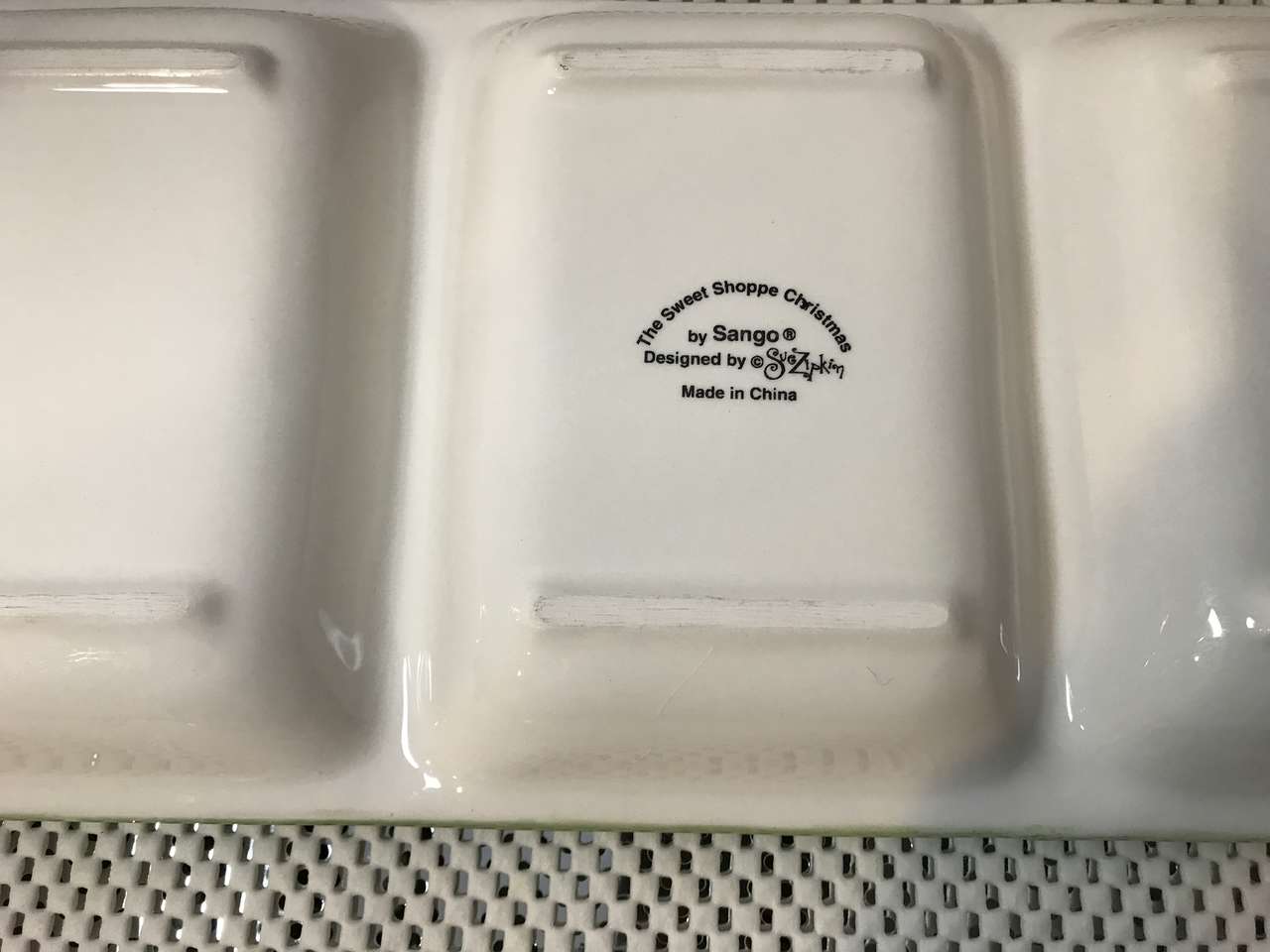 The Sweet Shoppe Christmas Center Tray By Sango ‘Sue Zipkin’ 17”L x 6”W, New. Great for candy, pretzel or other small treats etc. and Christmas 3 sections Treat Tray, 14" x 7", and Hallmark Spicy Snowman Sugar Cookies Plate with Recipe on Back, new and 1 green Snowman Oval Plate, $20.00