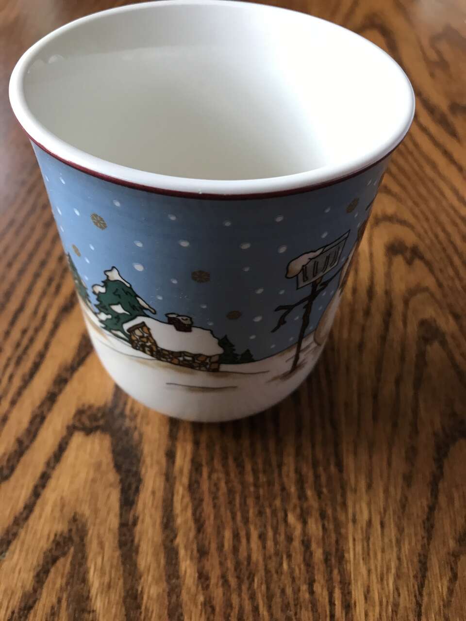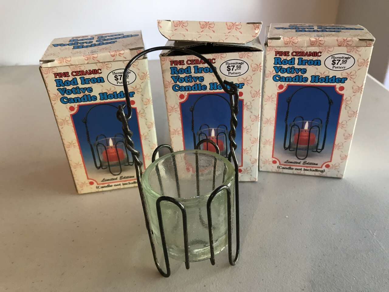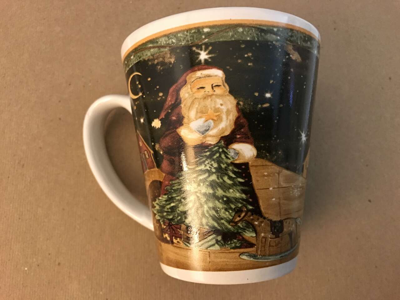 S'mores Marshmellow Man Hot Chocolate Mug, New, and Hot Chocolate Mug with Bears and Presents Design, and Snowman Mug for Hot Drinks by Cambridge Potteries, and Santa Hot Chocolate Stoneware Mug. and Rot Iron Votive Candle Holders set of 3, 4 1/2" High with handle down, (Candle not included) New, $20.00