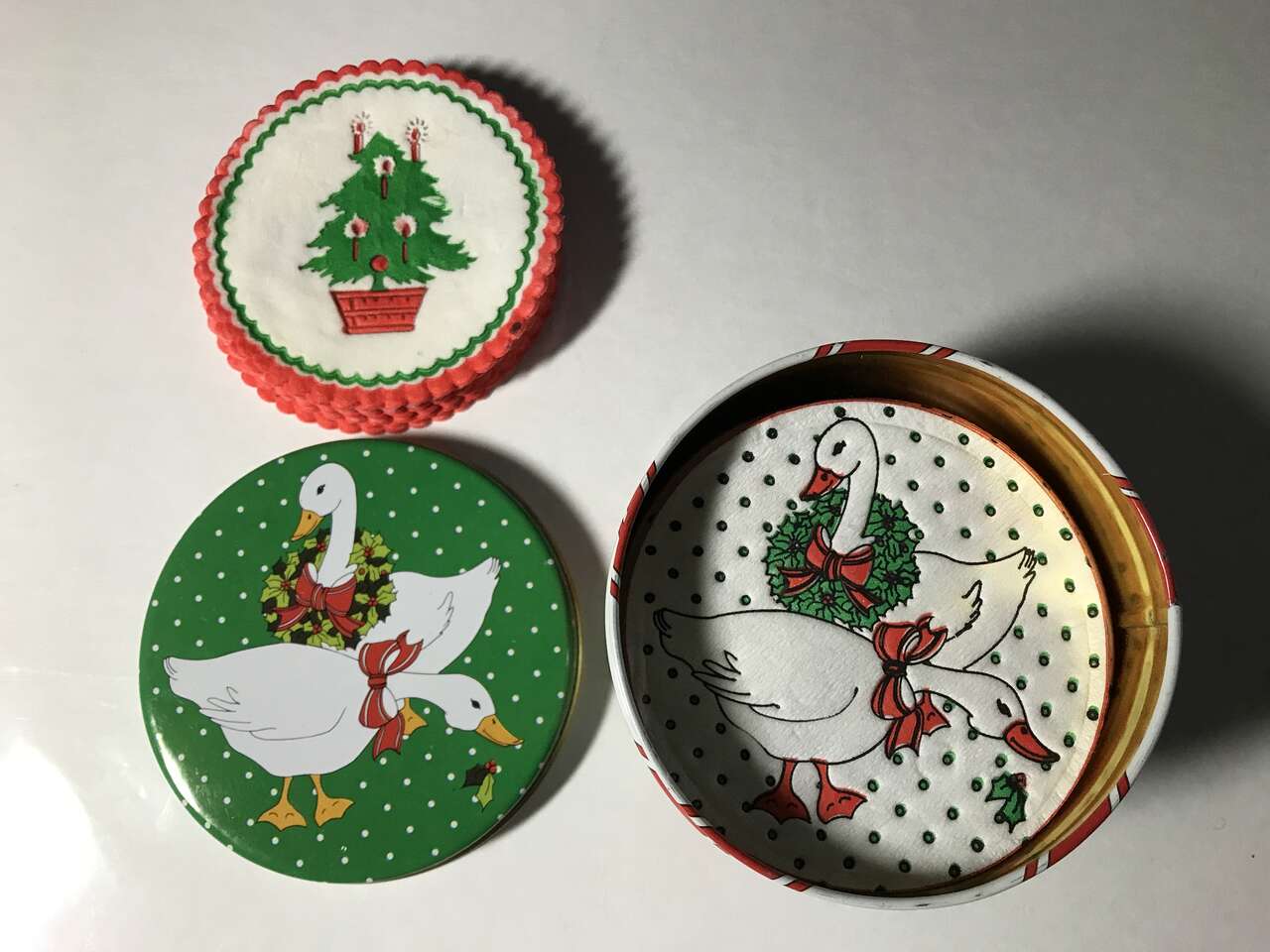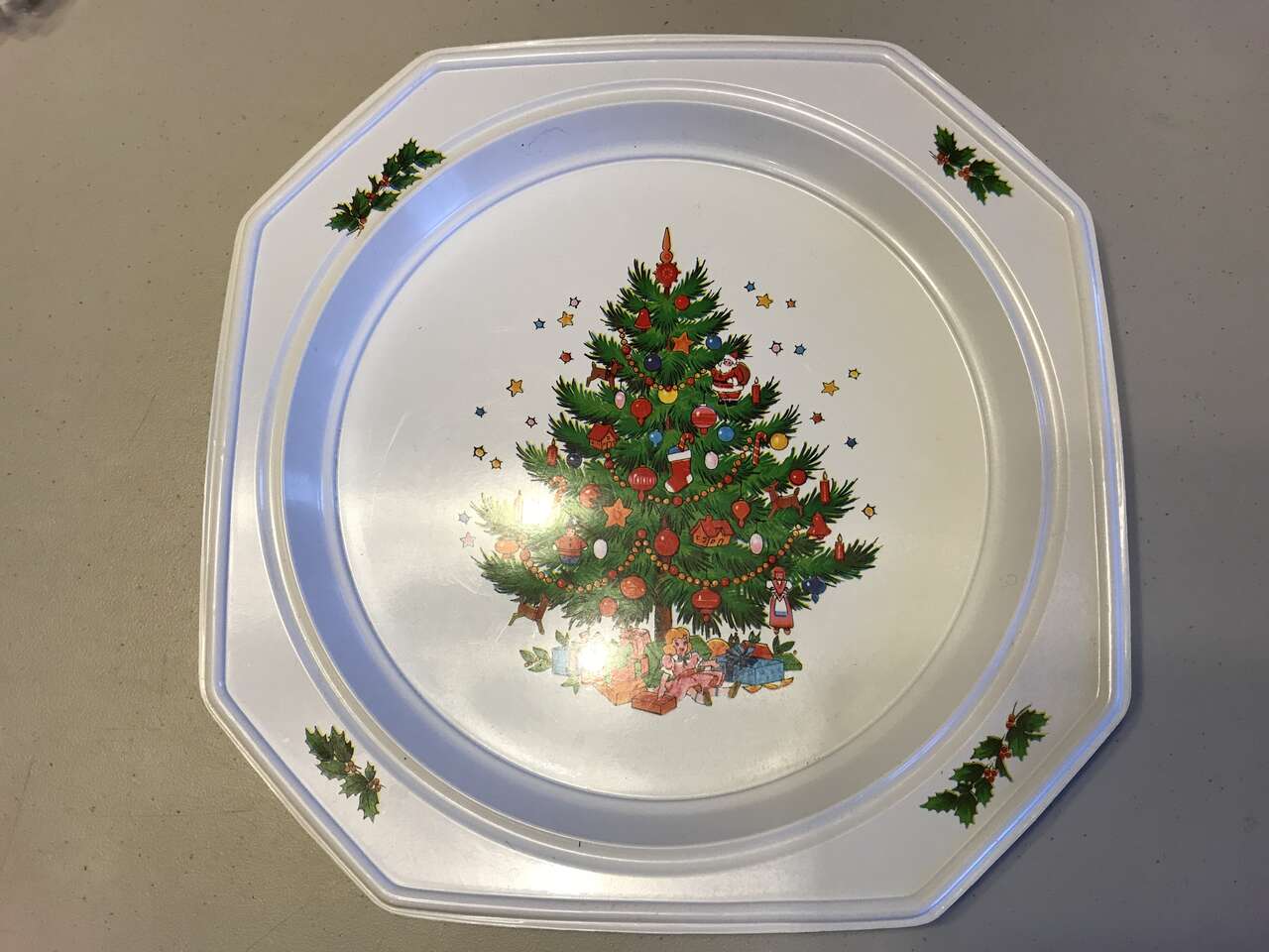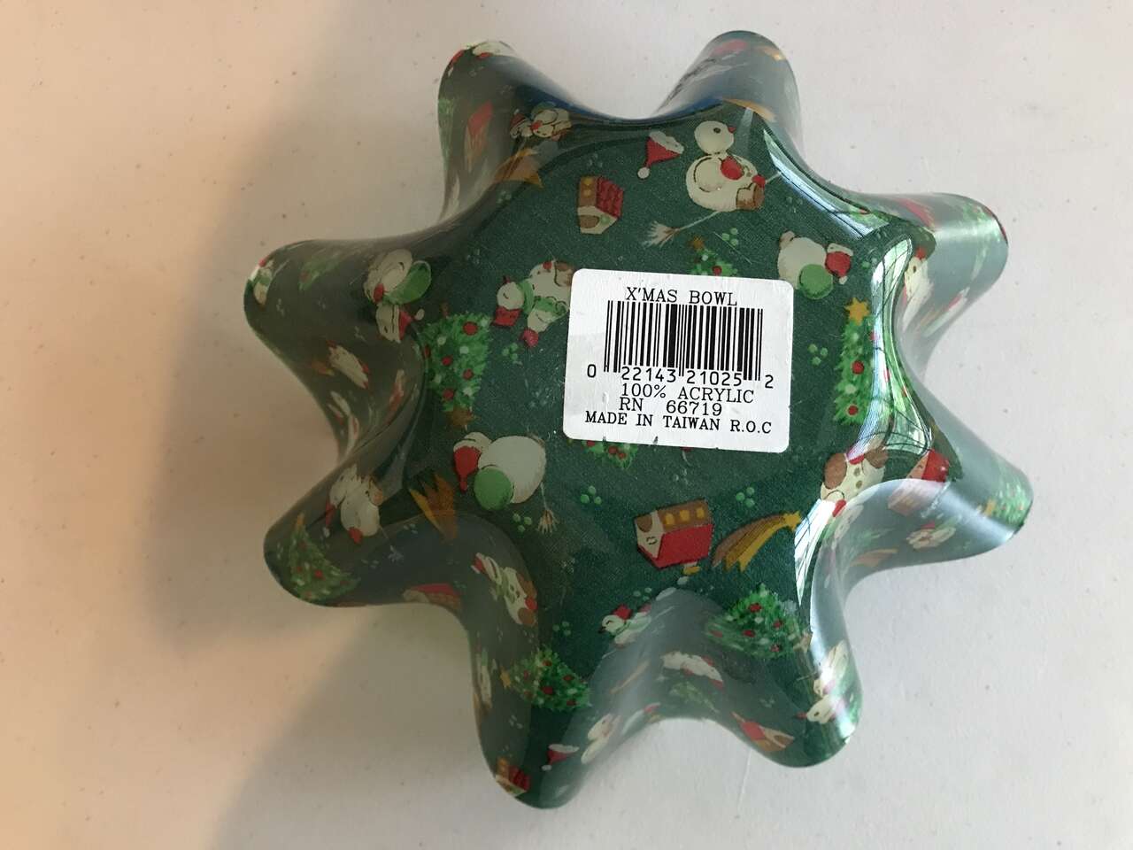 Christmas Stocking Tree Plastic Candy Dish, New, and X'mas Bowl, 4" High, 100% Acrylic, Made in Taiwan. New Old Stock, and 8 Plastic Christmas Plates to serve Goodies, pictures #15-19, New & Used, and Christmas Tree Candy Dish, New and Carolers Clear Candy Dish, 8"x7", Used, and Crate and Barrel Star-shaped Candy Dish Clear Glass 6"x2", New, No picture at this time and 1 Can of 50 Christmas Duck Coasters and 9 Tree Coasters, new, $20.00