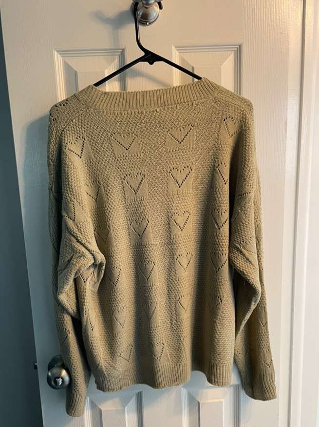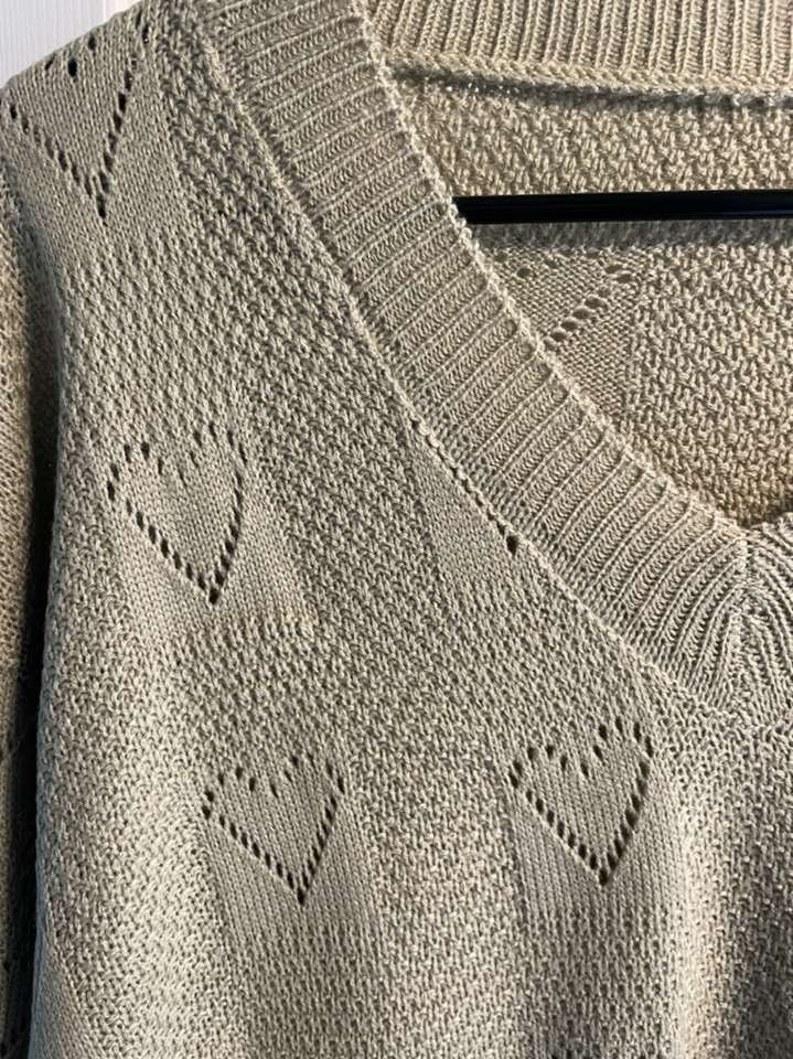 This is a long sleeve, v-neck, heart knit pattern sweater is in a women’s size small (4/6). It’s cream tan color depending on the lighting and is made out of a soft and stretchy fabric (acrylic). It shrinks less than most fabrics and is machine washable.