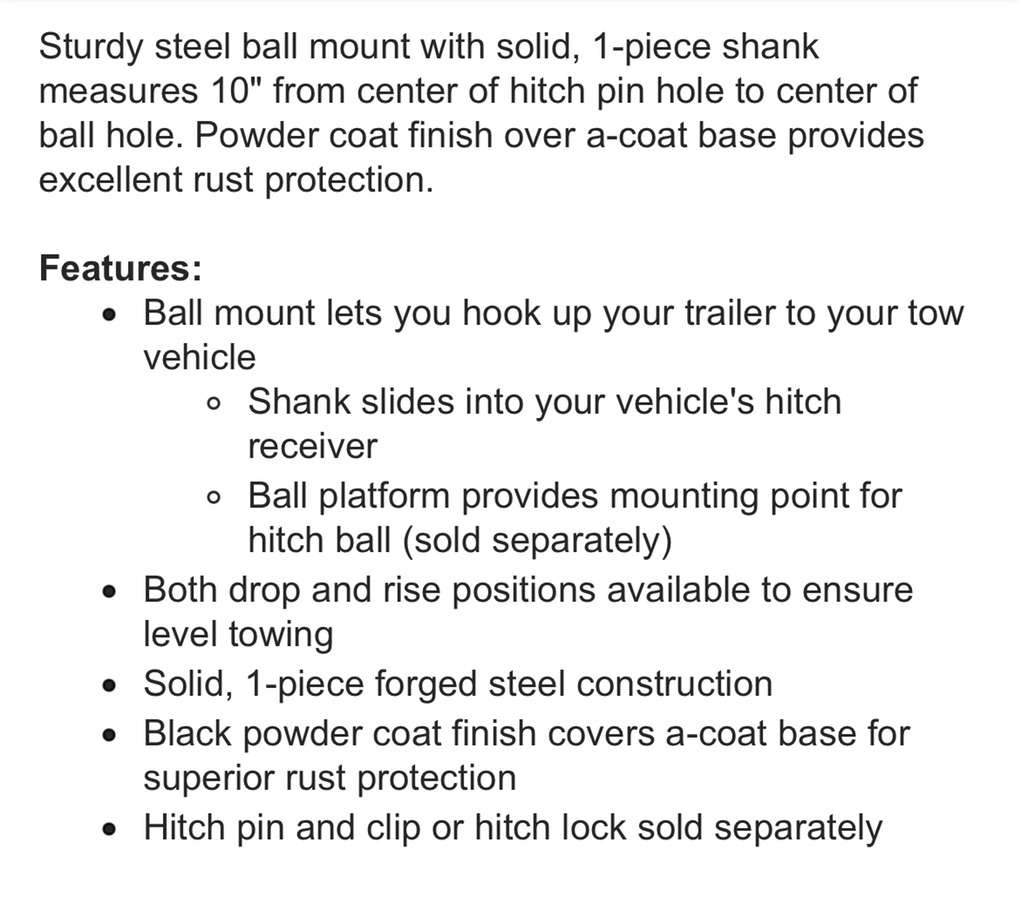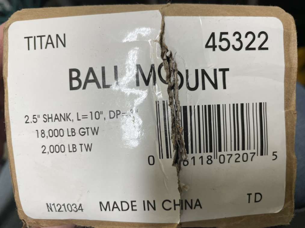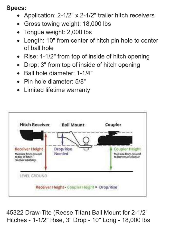 Description- Titan ball mount with 2.5” shank, 3” drop OR 1” rise and 18K LB gross weight/2K LB tongue weight rating. See photos for more product information and specifications.