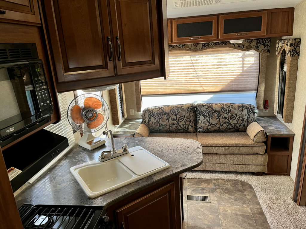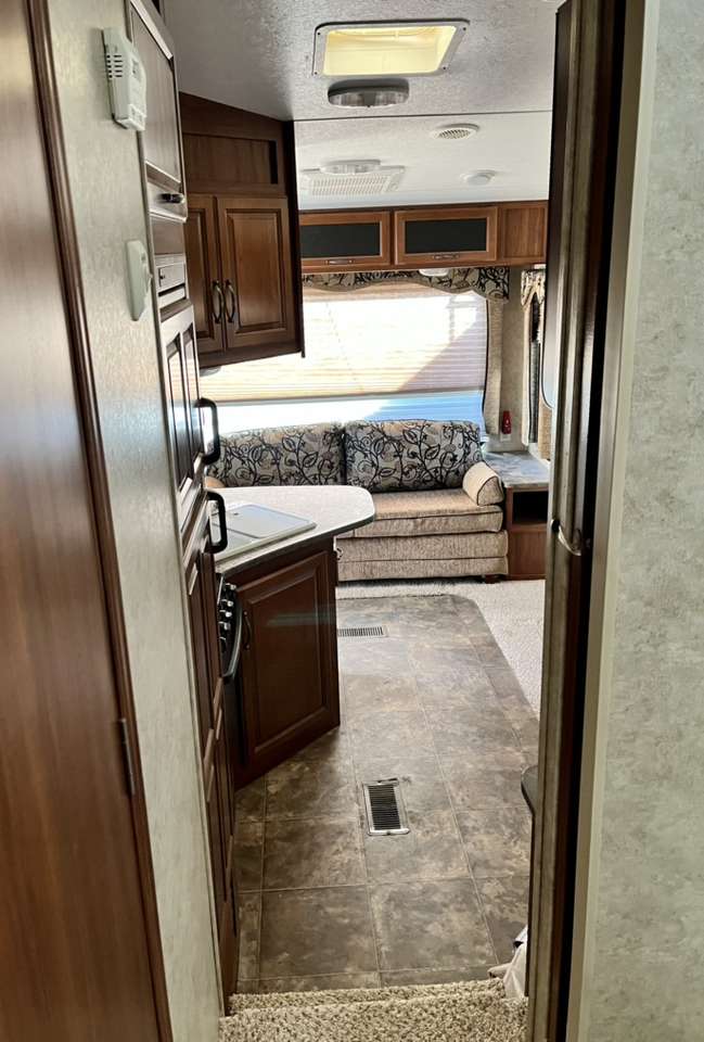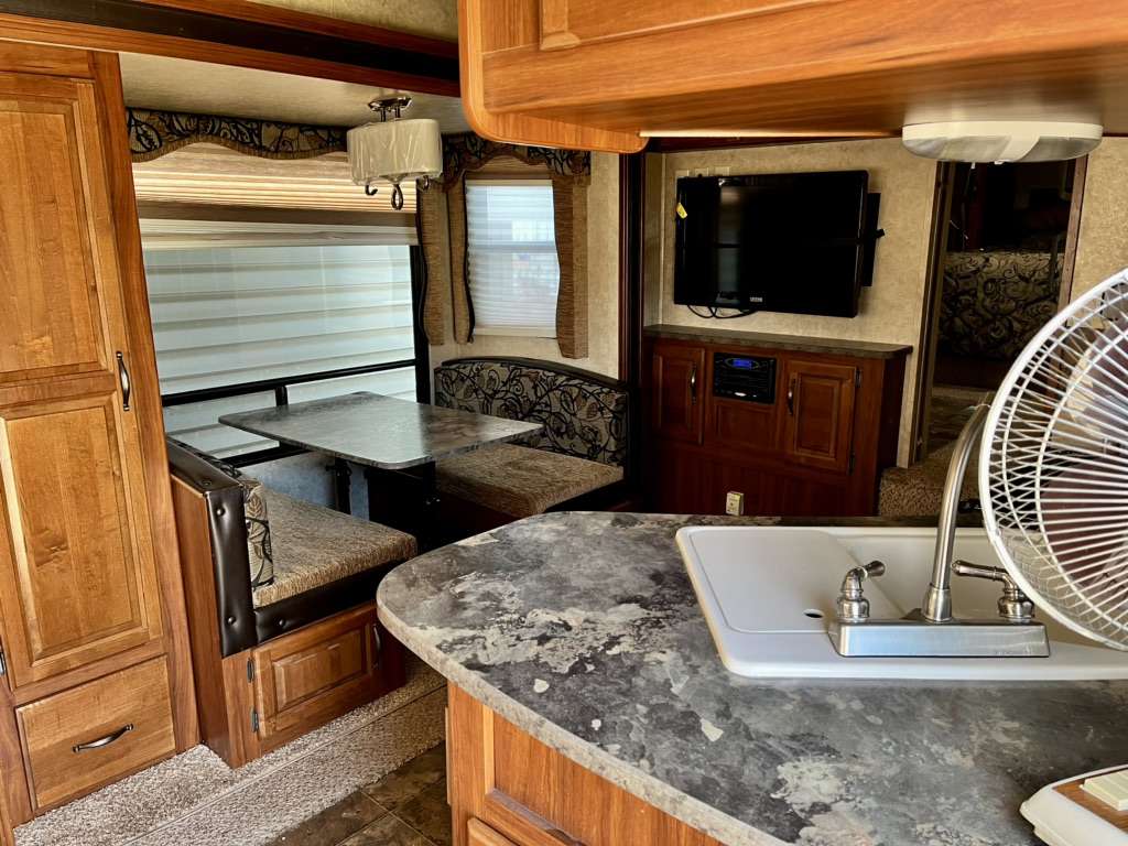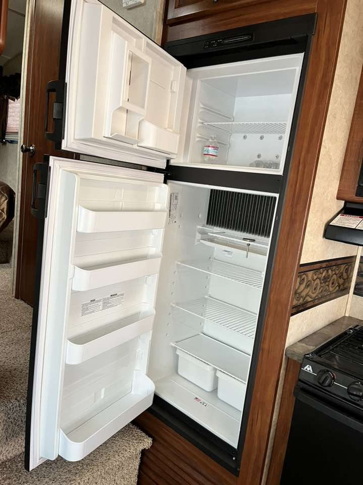 Specifications: Dimensions- Length 26.75 ft. (321 in.) Width 8 ft. (96 in.) Height 11.67 ft. (140 in.) Weight Dry Weight 6,833 lbs. Payload Capacity 3,237 lbs. GVWR 10,070 lbs. Hitch Weight 1,270 lbs. Holding Tanks Number Of Fresh Water Holding Tanks: 1 Total Fresh Water Tank Capacity 60.0 gal. Number Of Gray Water Holding Tanks 1 Total Gray Water Tank Capacity 76.0 gal. Number Of Black Water Holding Tanks 1 Total Black Water Tank Capacity 38.0 gal. Propane Tank(s) Number Of Propane Tanks 2 Total Propane Tank Capacity 60 lbs. Construction Body Material Aluminum Sidewall Construction Fiberglass Number of Doors 1 1 Power Retractable Slideout 1 Power Retractable Awning Leveling Jacks Leveling Jack Type Front Manual / Rear Manual Kitchen / Living Area Flooring Type Carpet / Vinyl Kitchen Table Configuration Bench Seats Kitchen Location Center Living Area Location Rear Oven / Stove Number Of Oven Burners 3 Overhead Fan Yes Refrigerator Size Mid-Size Refrigerator Power Mode Electric / Propane Sofa 1 Sofa Material Cloth