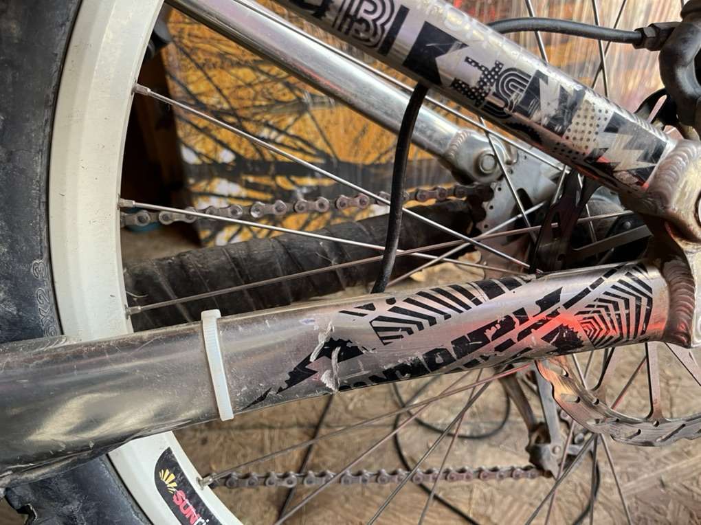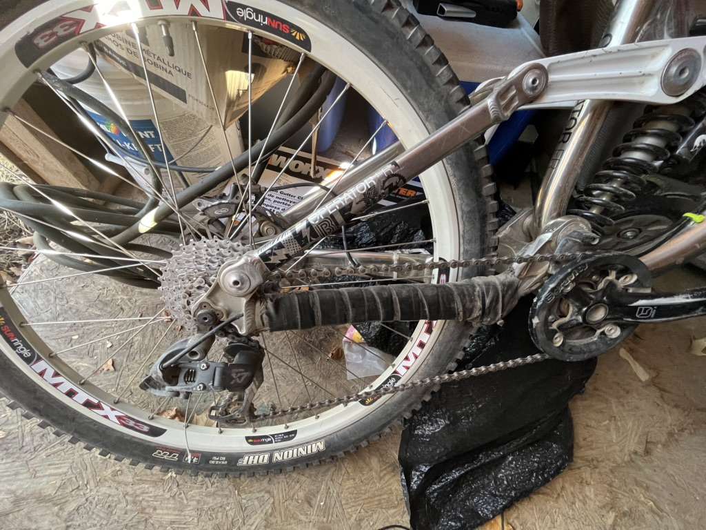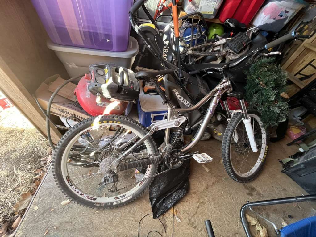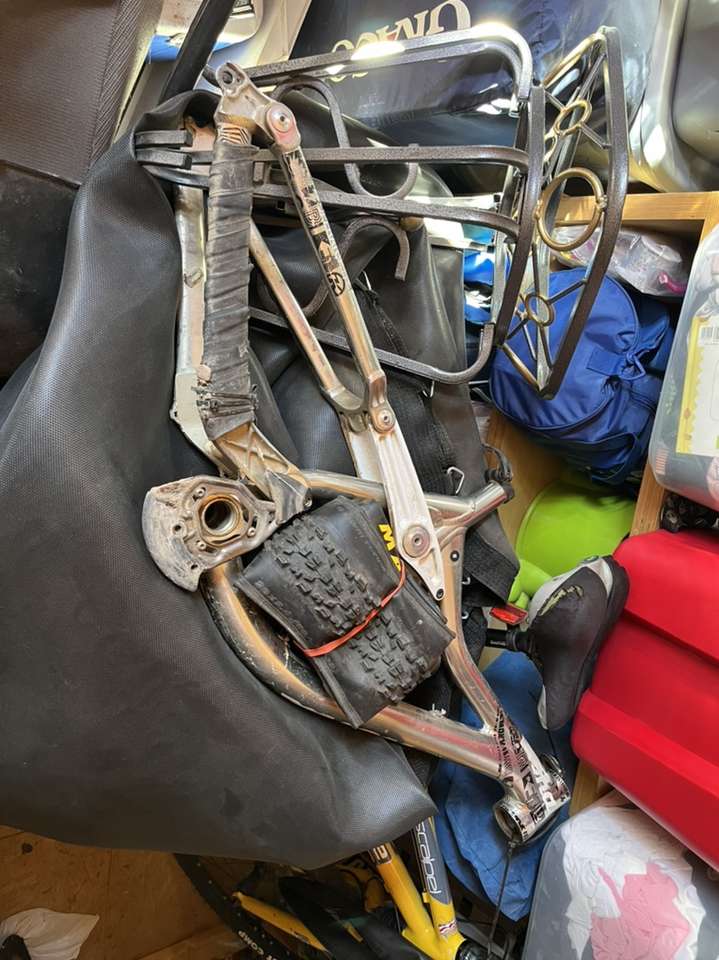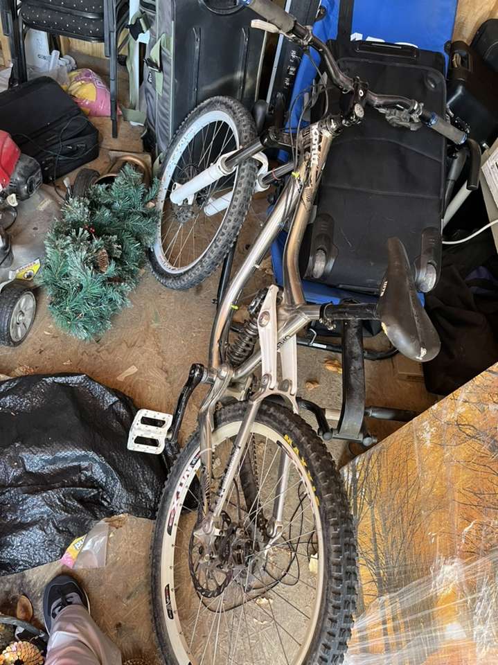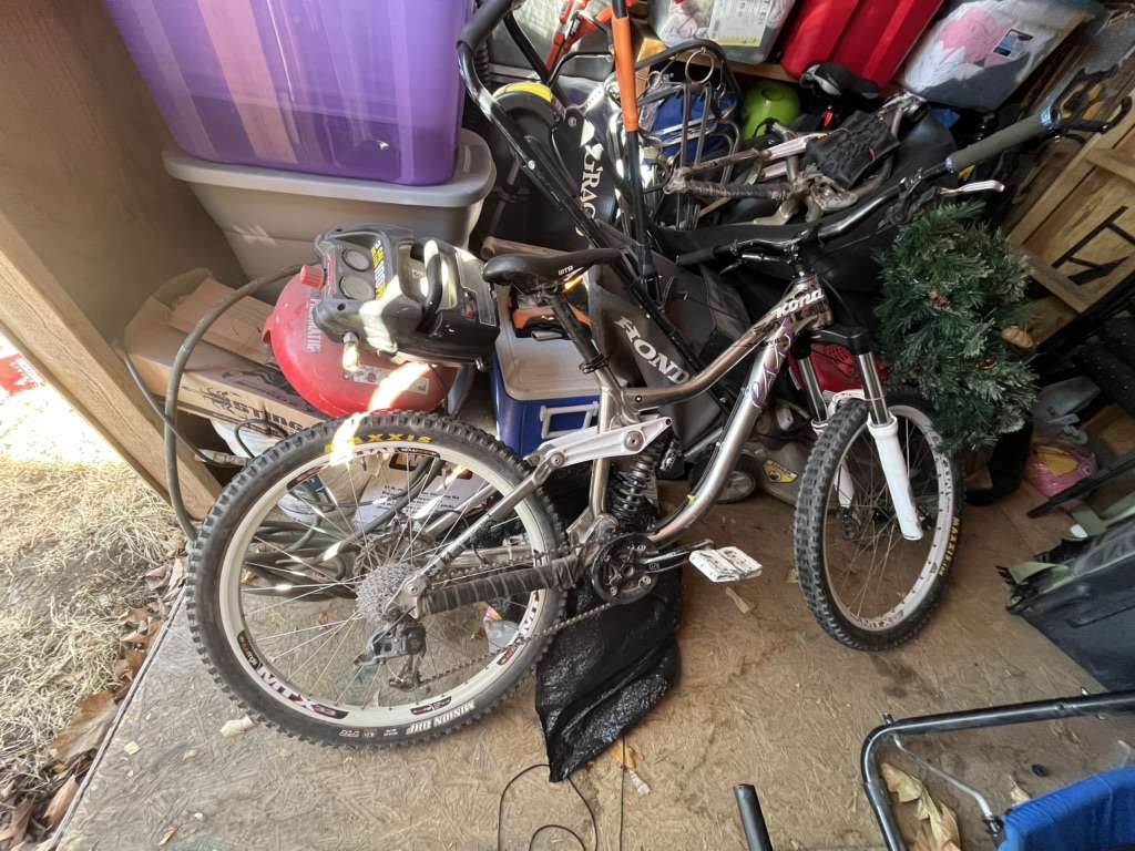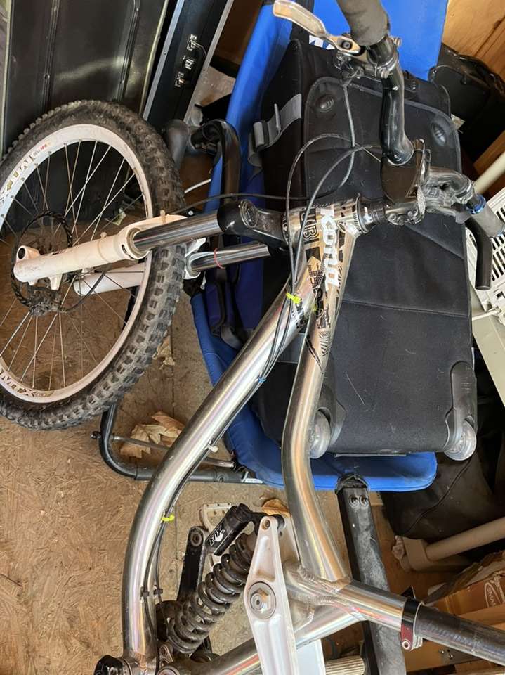 Frame size M, also includes a S size frame. Includes spare tire. Shocks work great. Brakes and drivetrain are great. There is a dent on the rear subframe, you can switch it from the S size frame which is included jf you want