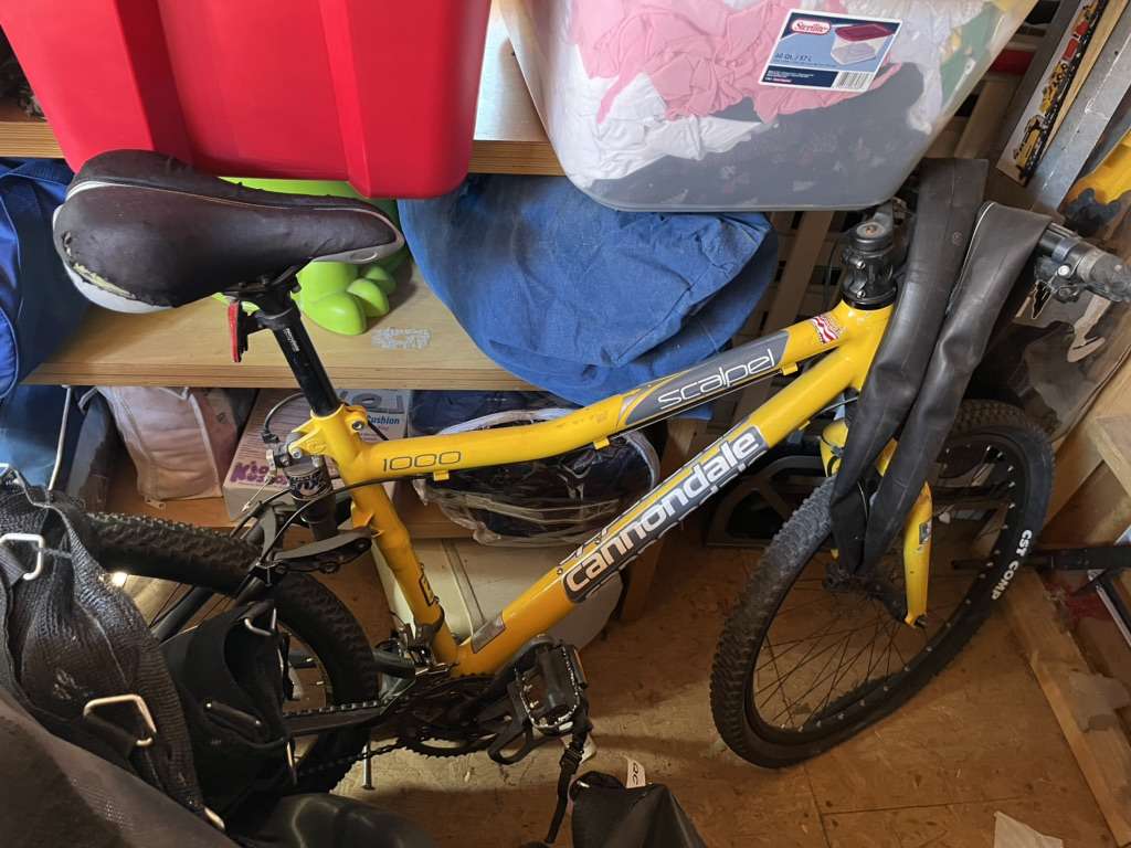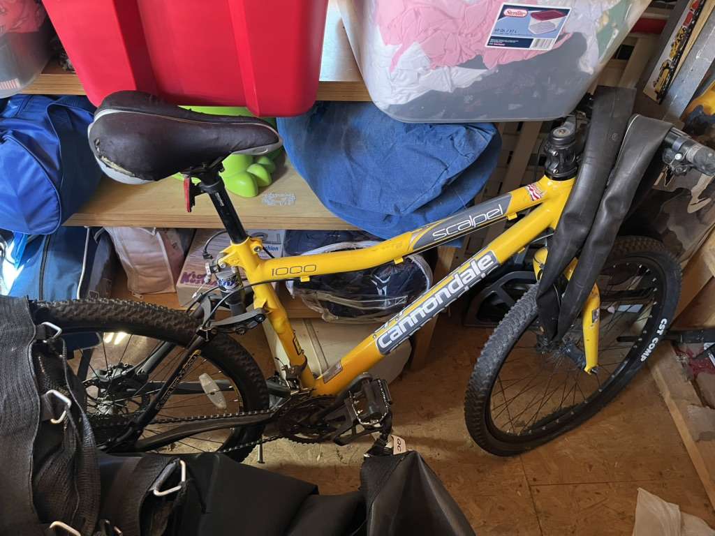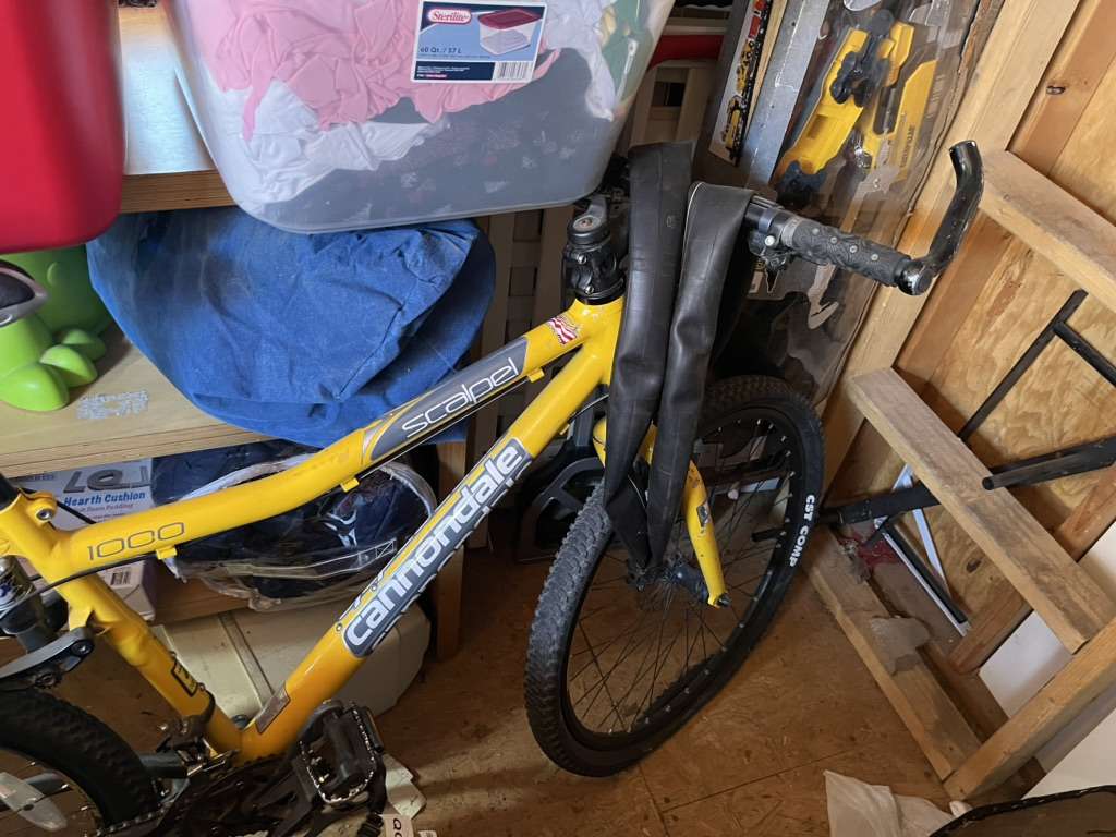I believe it’s a size L. Tires are flat, one needs the tube to be replace but spare tube is included. Front shock doesn’t lock up. Rear shock in good shape, was tuned up last fall and never ridden since. XTR rear derailer. It just needs a new tube in front and it will ride great.
