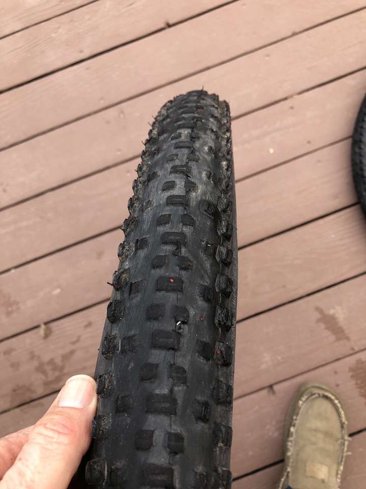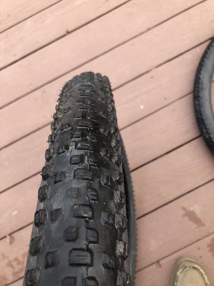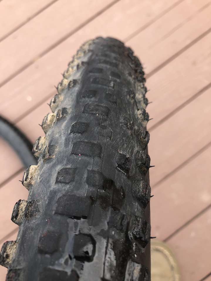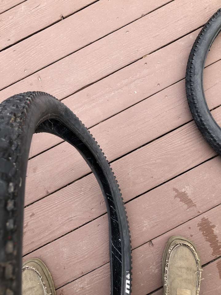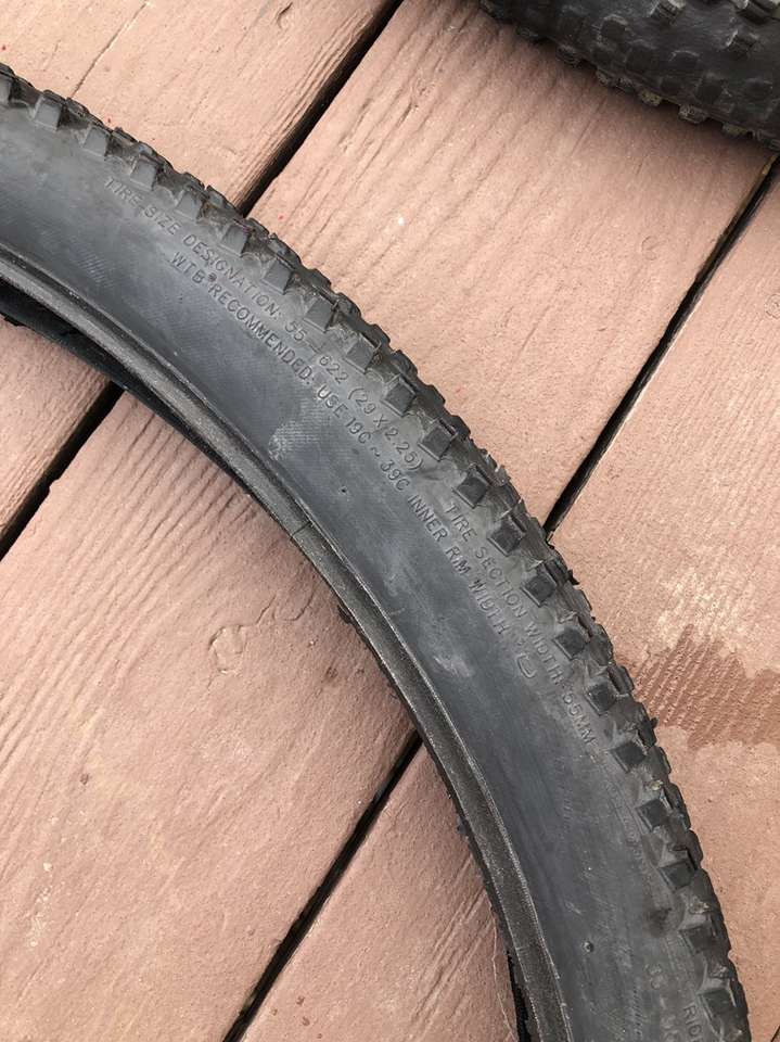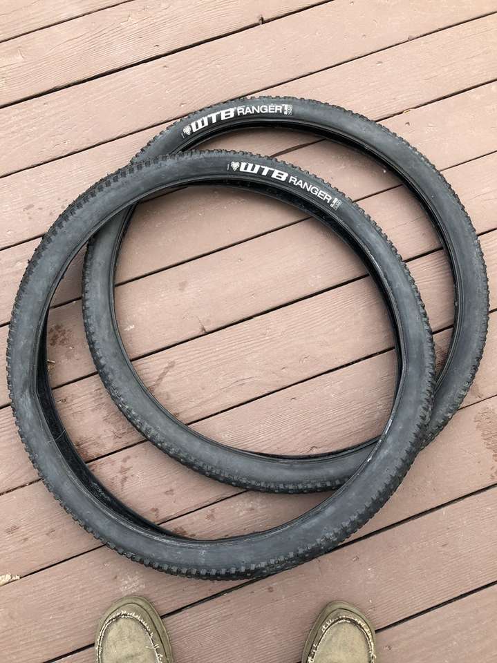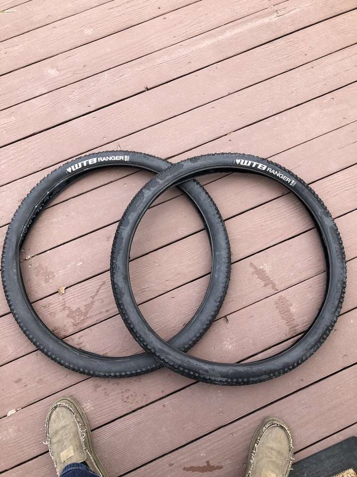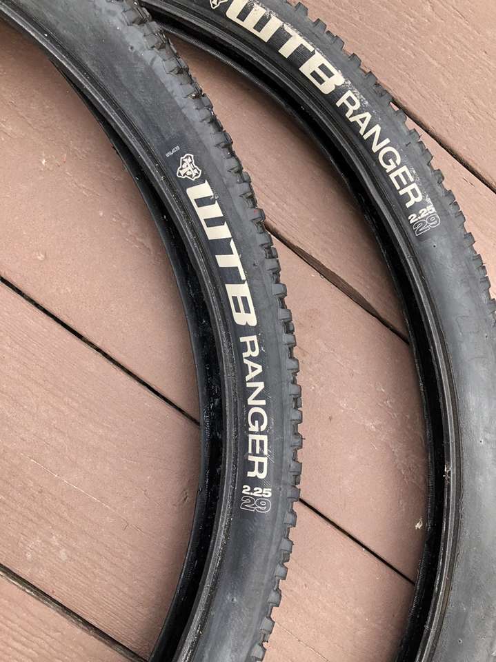 What you’re looking at is a pair of WTB 29er tires in significantly used condition. A closer inspection of the images reveals the crown on these bad boys have seen some serious trail action but that there is still a good amount of tread depth on the sides.