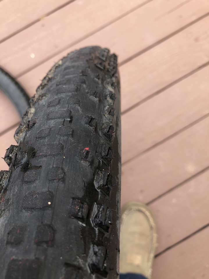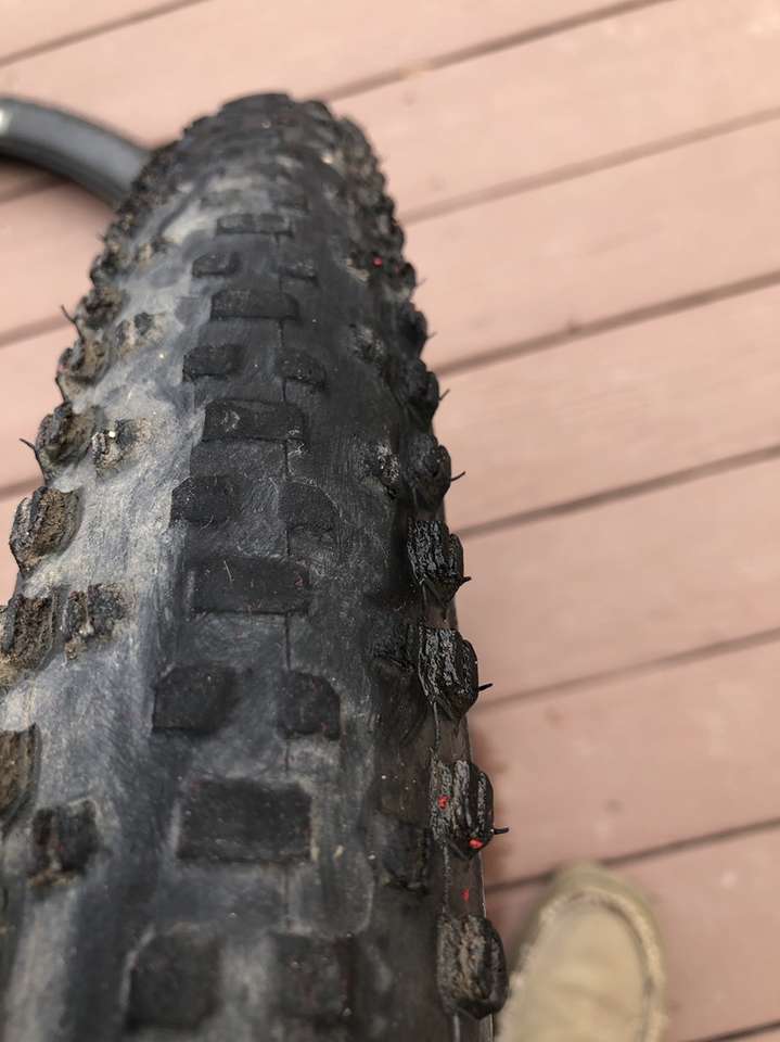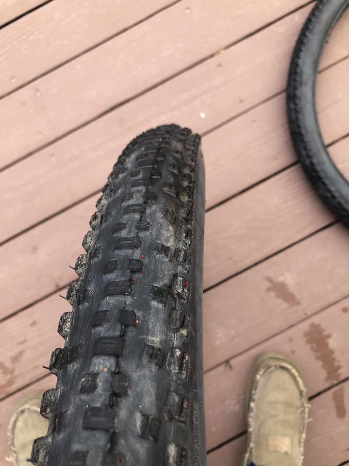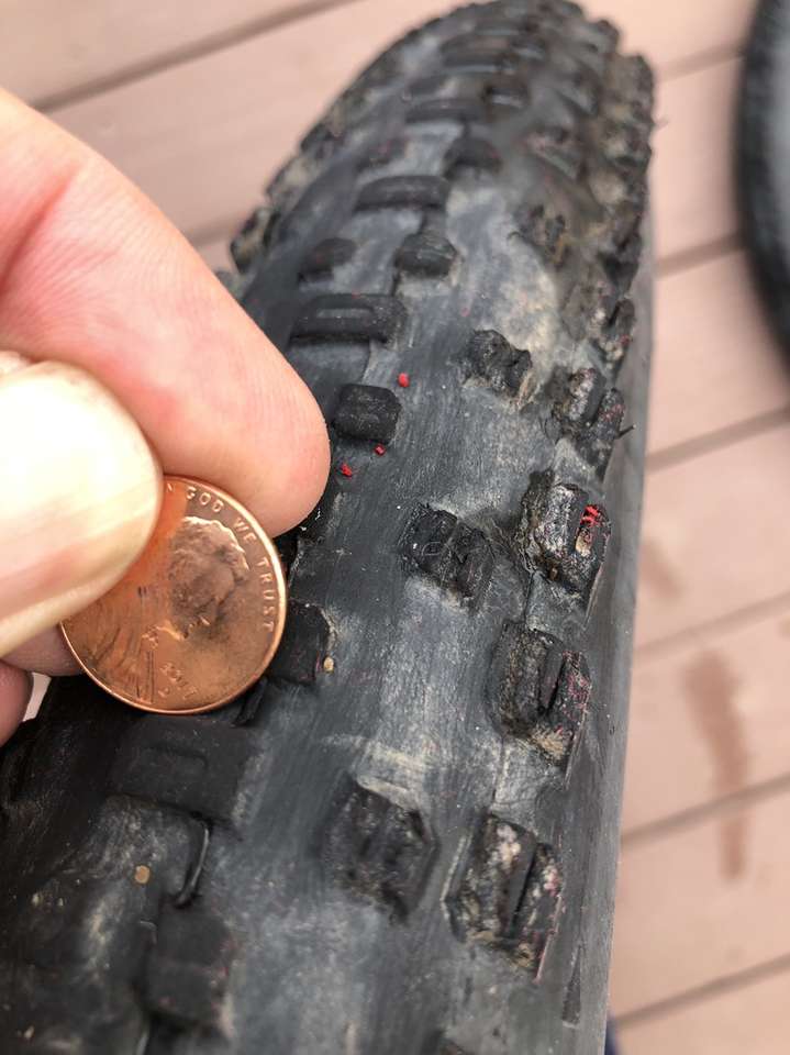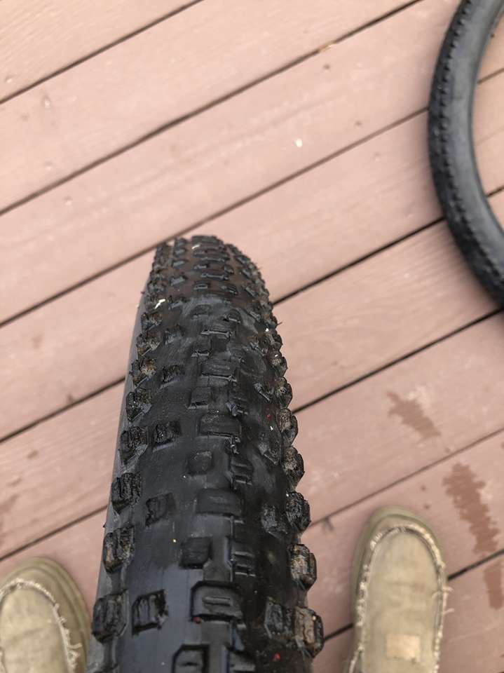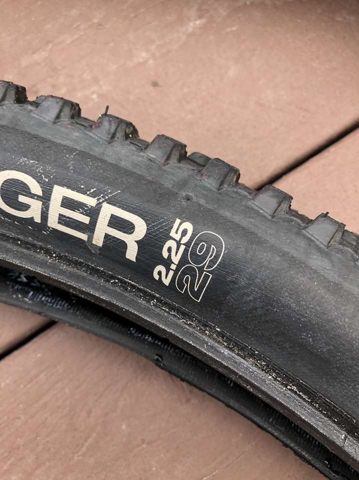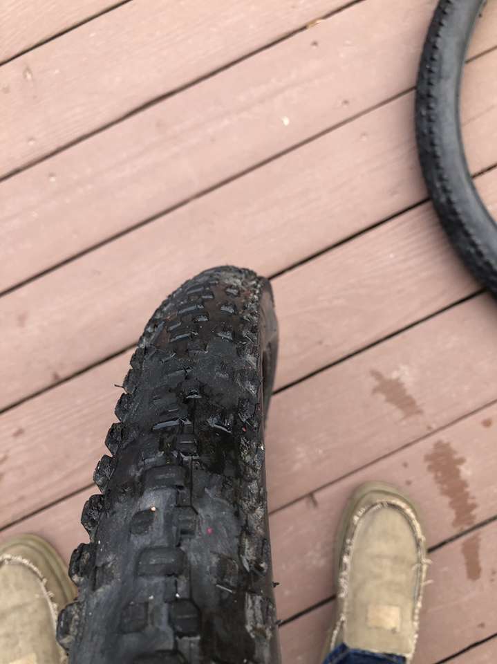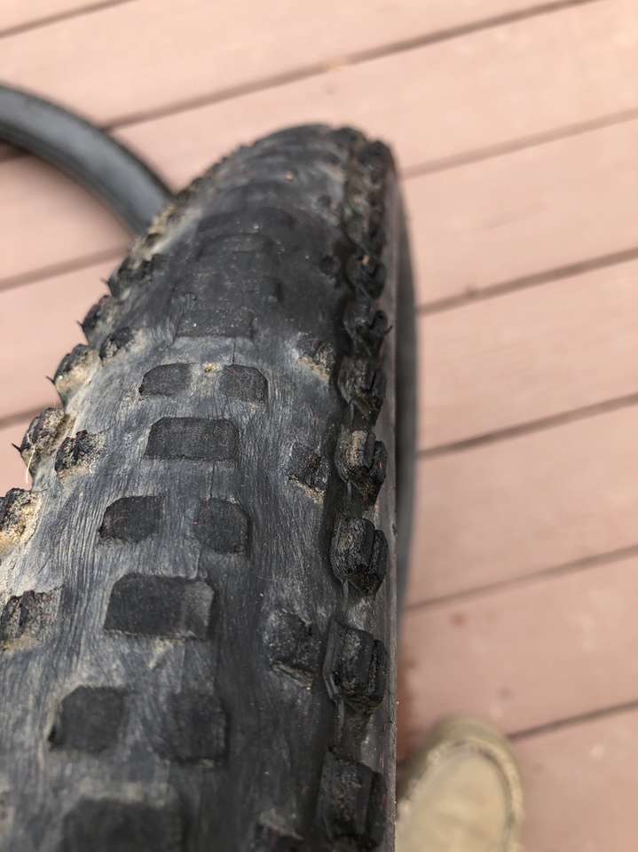 What you’re looking at is a pair of WTB 29er tires in significantly used condition. A closer inspection of the images reveals the crown on these bad boys have seen some serious trail action but that there is still a good amount of tread depth on the sides.