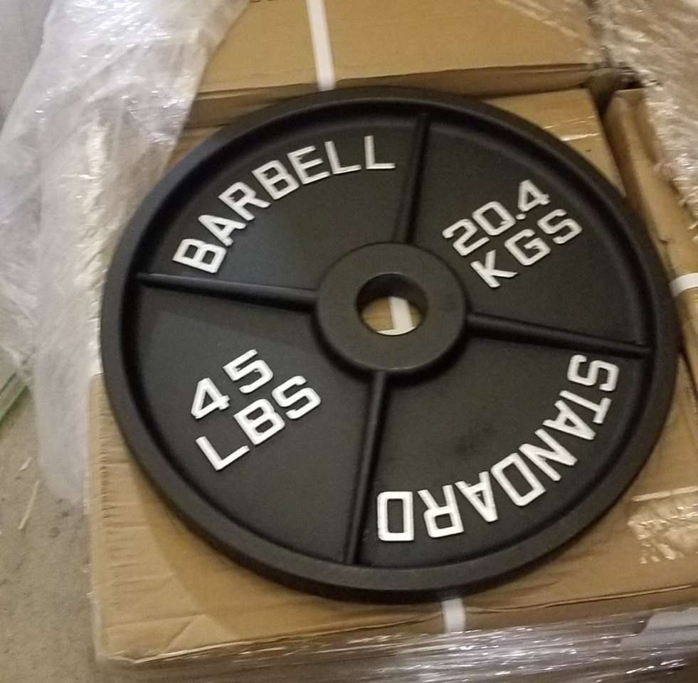 OPMP-P45: 45lb Standard Olympic Black metal plates for $140/pair + sales tax = $150. If you bought these metal plates from us before send us a picture of the ones you have so we can try to match them up. We have 5 different variations.