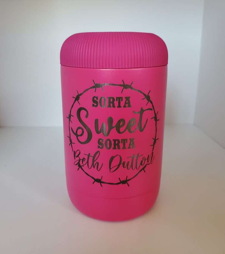 Personalized can cooler. See pictures for fill description. Fits regular cans, tall cans & bottles!! Or you can unscrew the top and use as your own cup. Personally its the best I've found. Let me know what you want on it and I will laser it. I have the pink and gray colors.